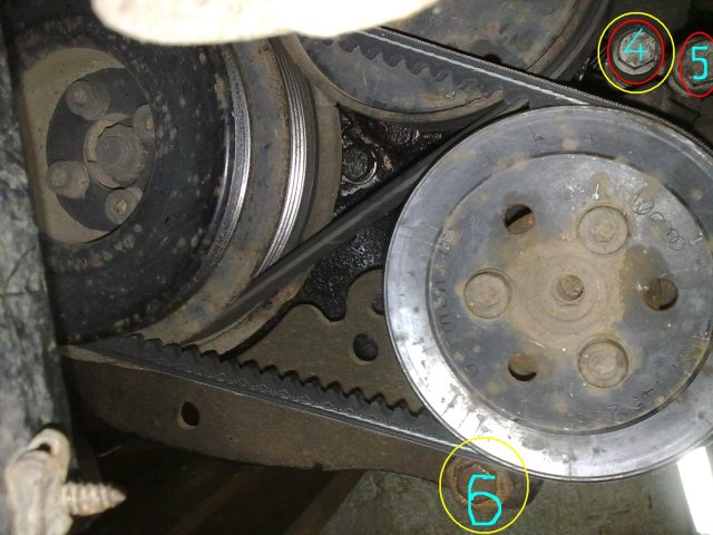 За да се махне помпата на хидравликата могат да се развият само болтовете показани с жълти кръгове и стрекли. Аз лично използвах следната последователност отвъртъях първо болт 1 и 2. При болт 1 използвах лула пнеже тази тръбичка на хидравликата пречи да се вкара камък от гидория.След това болт 4 с гидория. И накрая болт 6 като се освободи този болт ремъка може свободно да се махне и помпата остава във ръцете ви хубаво е да я отместите и подпрете на някое тупче или да я вържете с нещо.