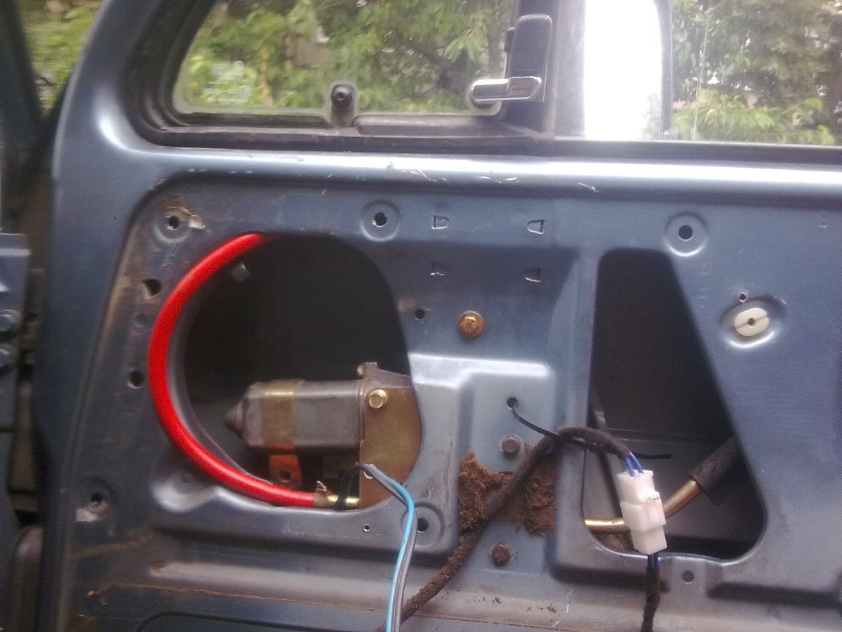 И покрай суетнята около халогените(бях разглобил таблото с уредите за да свържа халогенчетата към оригиналния бутон за допълнителни фарове)си подмених и дясното триъгълно отваряемо стъкло.Всъщност, смених само гуменото уплътнение, защото старото е за модела със лайстната, а аз нямах такава и свирукаше като млековарка.И така и така бях свалил всичко от вратата си монтирах оригиналните машинки за ел. стъкла. Оригинални от Каравеле и Транспортер.Самите машинки ги взех от Ицо(batchi),за което му благодаря най сърдечно. Но си оставих окабеляването от предишния кит.Т.е. смених само хардуера :mhihi Сега вдигането на стъклата е както трябва да бъде.