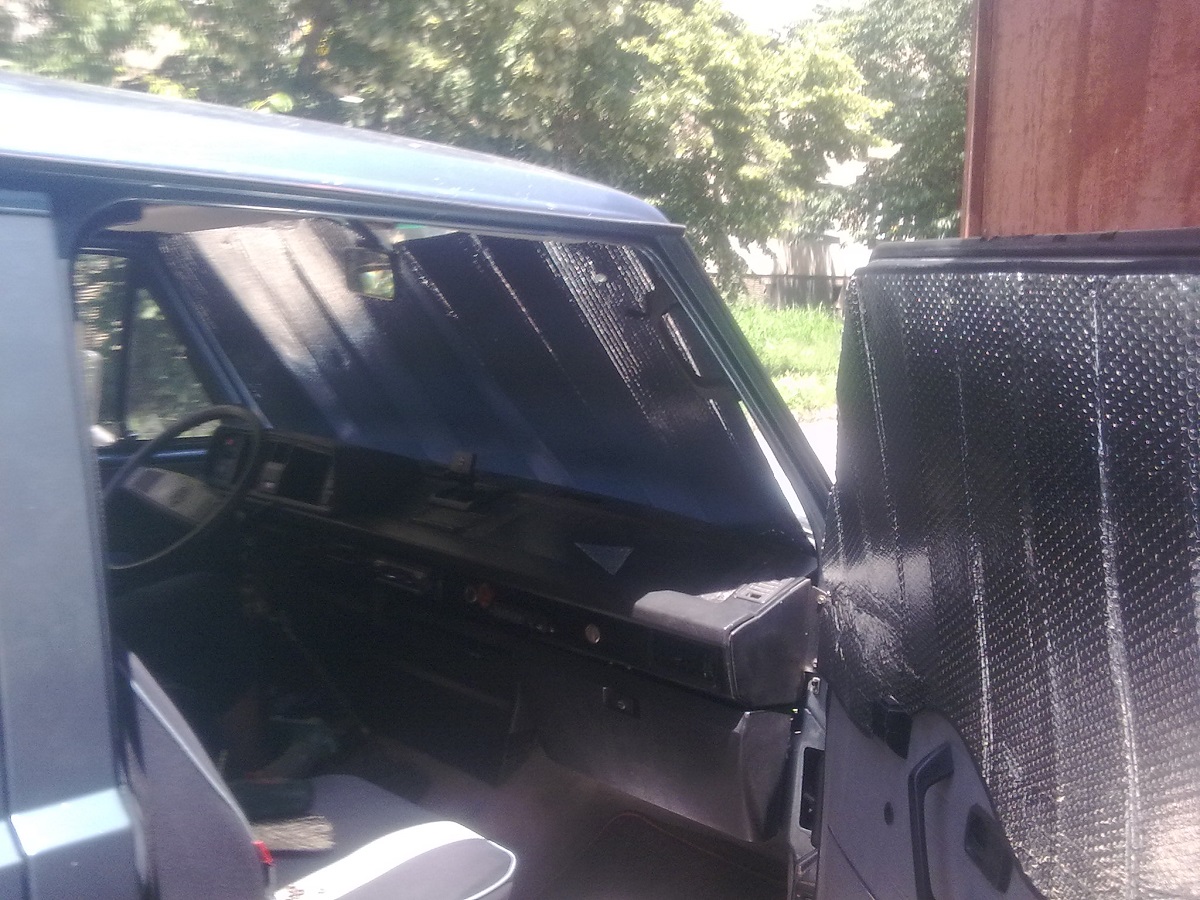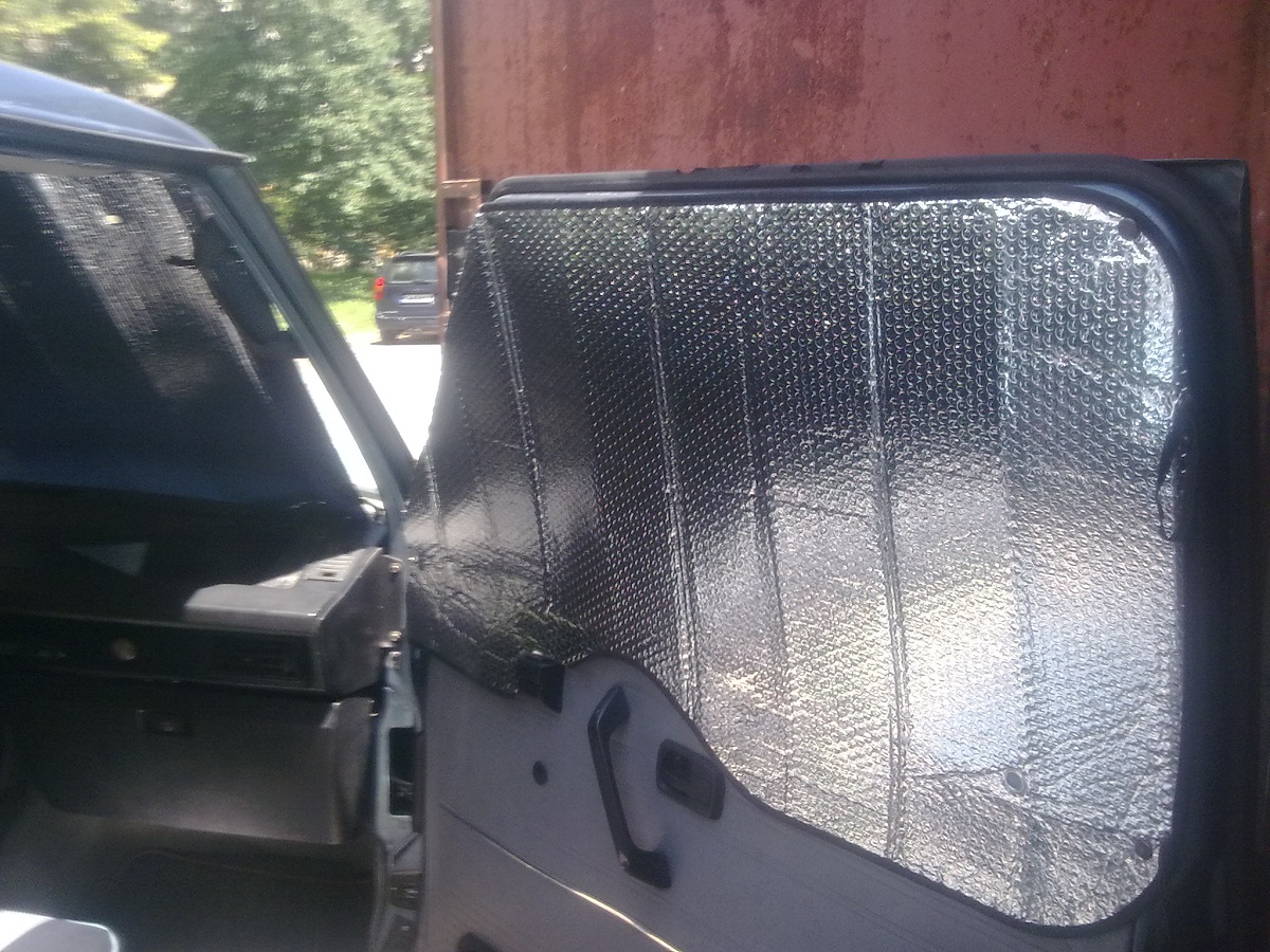 И тъй като отзад се запердихме..... :mhihi трябваше и за отпред да се помисли нещо.Купих си от слънцезащитните платна...на предното стъкло с точен размер...а за страничните импровизирах.
