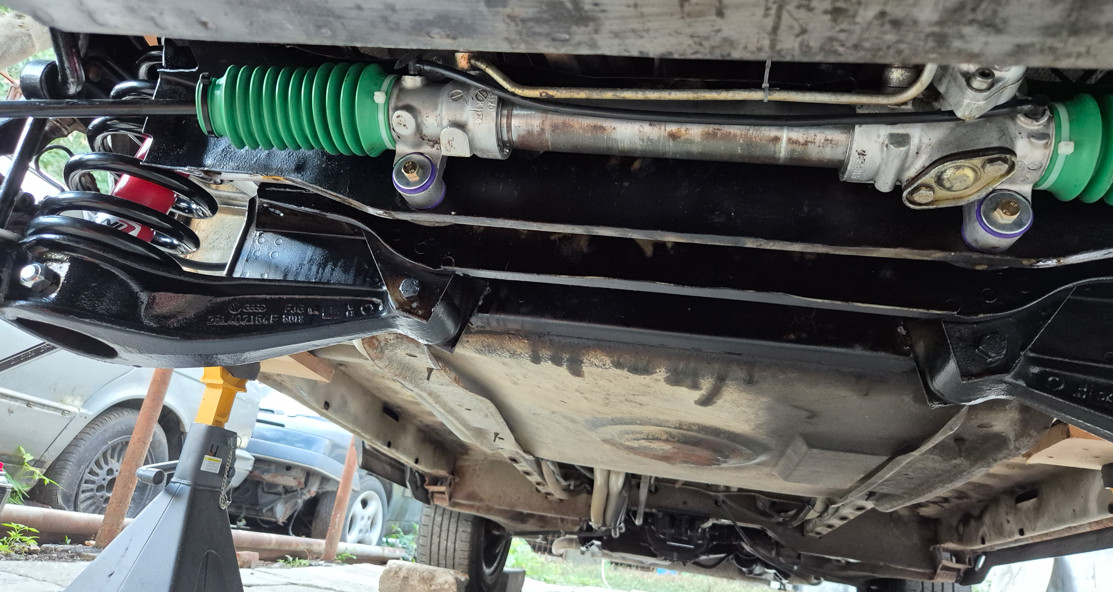 Тампоните на хидравличната рейка подмених с нови PowerFlex. Сложих допълнително укрепване на рейката. След първите две карания мога да кажа, че има ефект, но за да съм по-категоричен в оценката си, трябва да го тествам и на магистрална скорост.