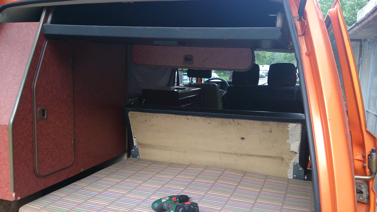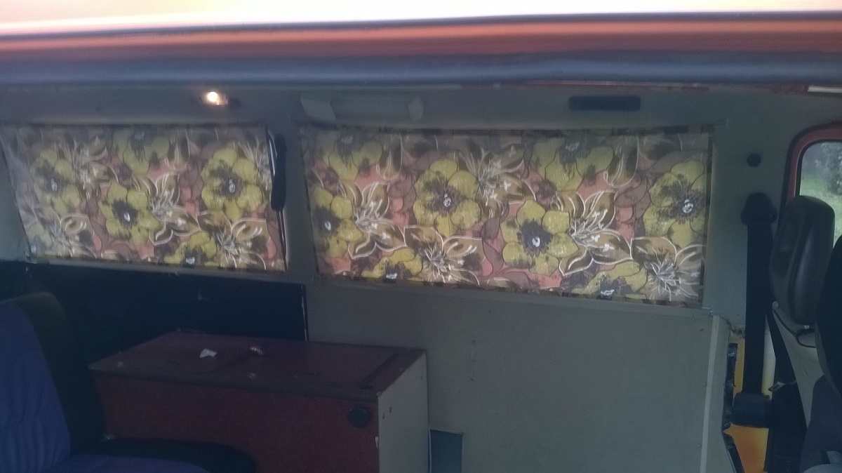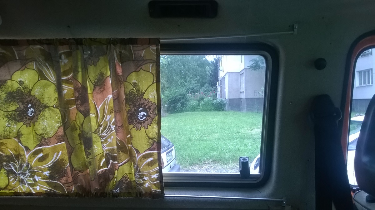 Време беше да направя пердета за постоянно.От магазин в София взех алуминови тръбички Ф6 и една ф8.Също така и една винкелче,също алуминово,1х1см. И с помощта на Андро(Месията 666)направихме корнизи за пердетата. Момент преди да извадим шкафовете от буса.