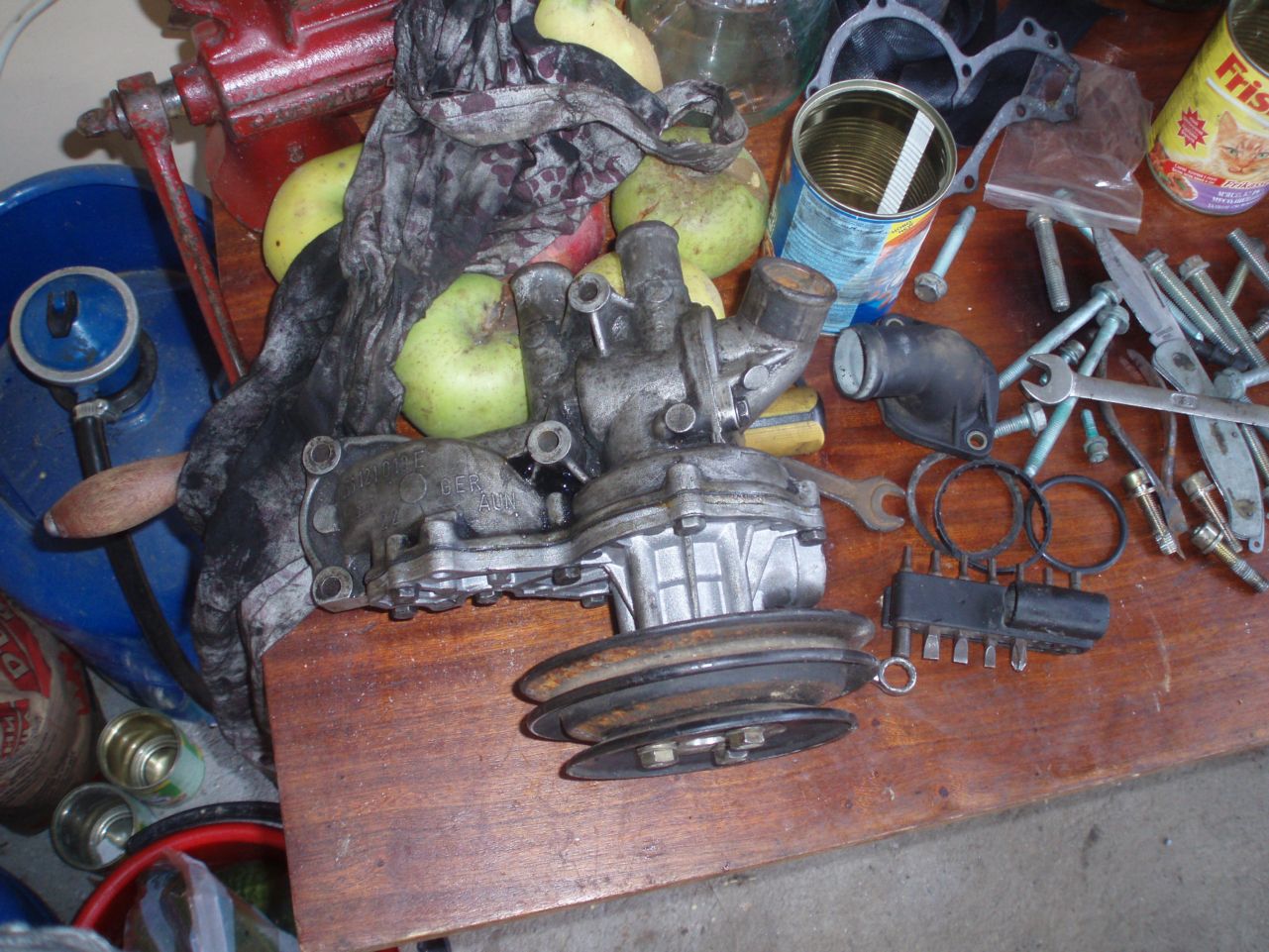 И така,докато чаках гарнитурата се заех да напасна водната помпа.Преди да разбера за проблема с превъртането на двг-то,ходих до града за водна помпа и лагерчето на маховика.С което се оказа ,че също има проблем.Самото лагерче по стандарт нa VW e 15мм върешно и 21мм външно.Само че опашката на скоростите се оказа 14мм.В друг магазин на SKF намерих 14мм вътрешно и 20мм външно.Поставих второто ,като за уплатняване ползвах латун.Пасна идеално.