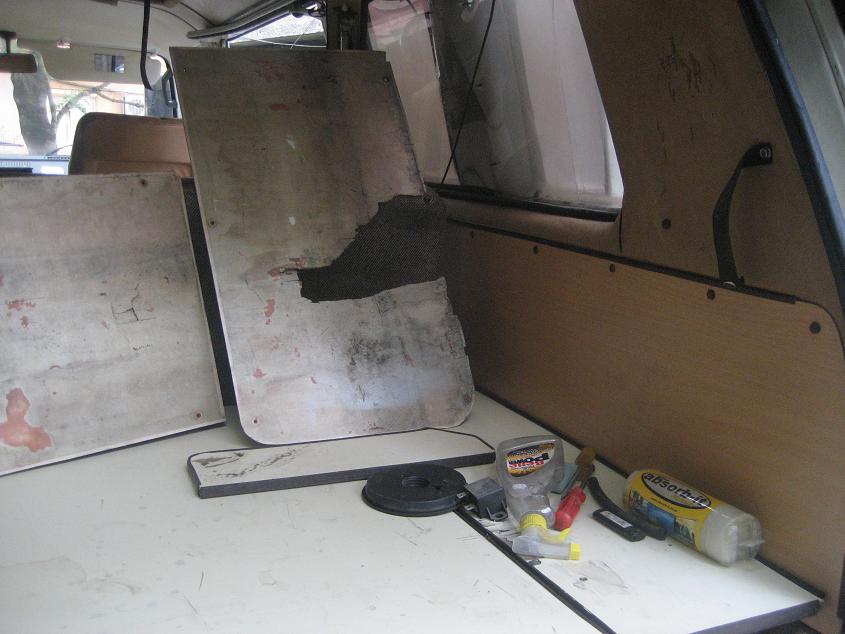 След като огледах всичкия интериор забелязах, че от страничните панели от дясната страна не бе останал нито един който да е здрав, пода който беше талашит покрит с балатум отгоре се беше резпаднал и станал на прах под въздействието на изминалите години, пренасяните строителни материали и разливаните течности. След като направих едно кратко няколко минутно съвещание със себе си, бързо взех кардиналното решение за тотално разкостване на оборудването, замяна на пода и страничните панели с нови, защото състоянието на наличните изобщо не бе това за което си мечтае един новодомец! Речено – сторено!