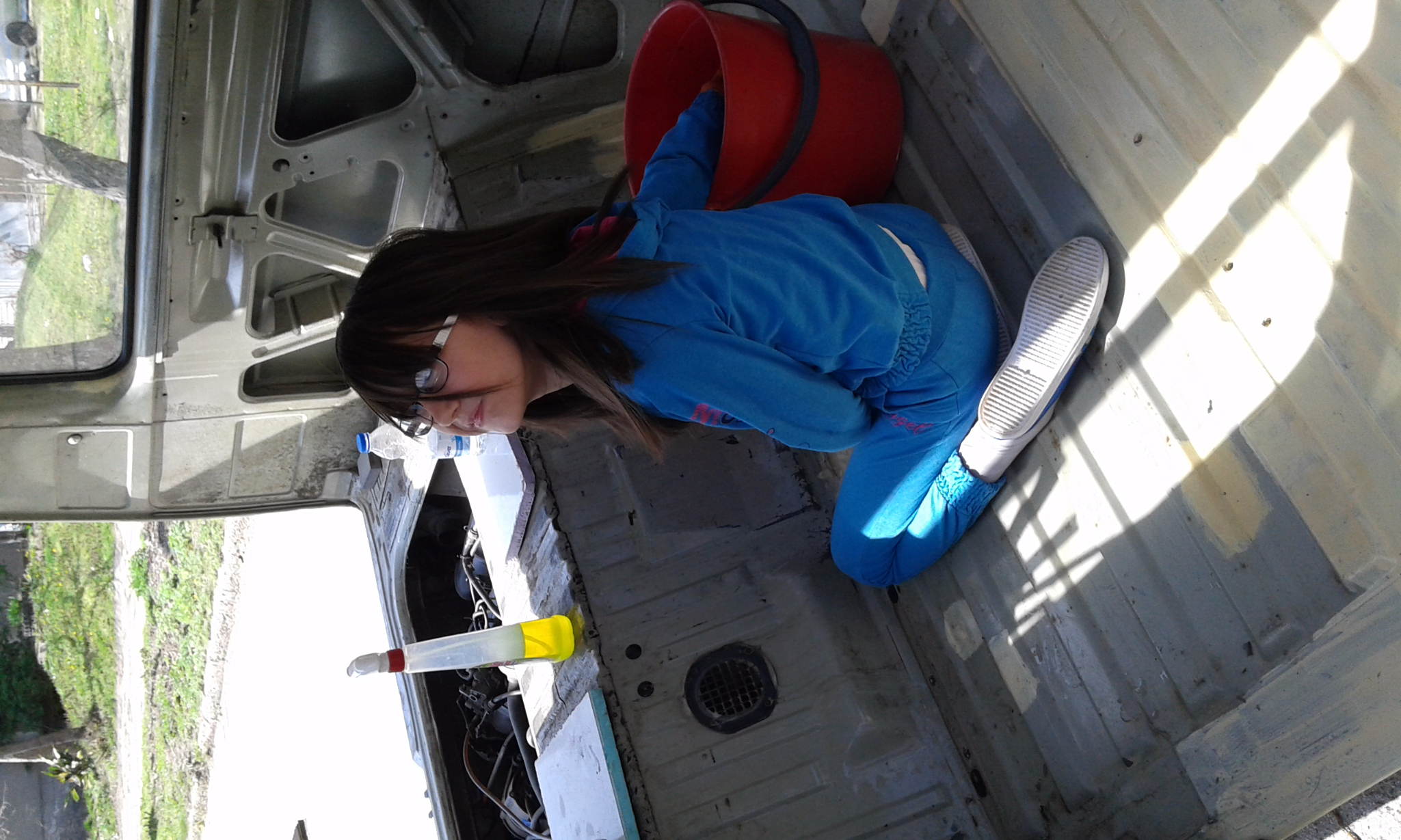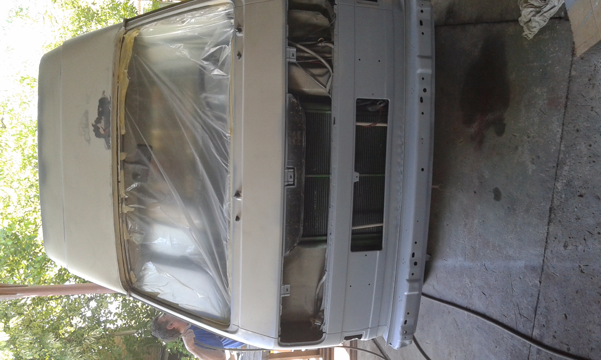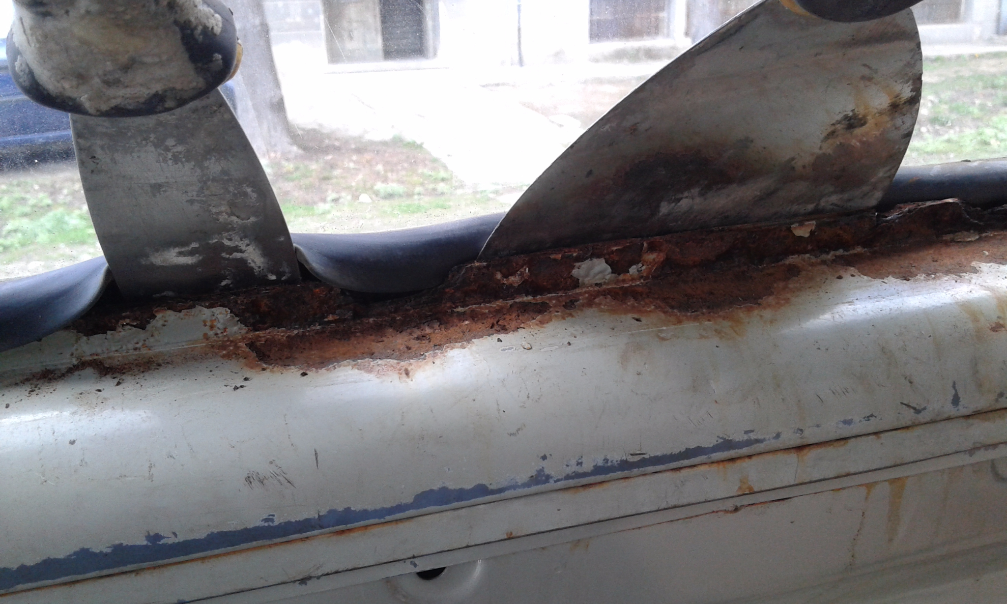Премахване на полиуретана от горните вежди над прозорците уплътняващ надстройката (голяма кушия) почистване до чист метал. Третиране с концентрирана фосфорна киселина местата където не може да достигне четката, след това MrZink, грунд, нов полиуретан Den Brawen.