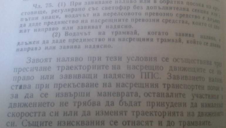 Та така,както Владо е цитирал сухо чл.75,завиващия на ляво чака насрещните.Проблемът в тогавашните листовки и съответно закони и разяснения е този,че на всички картинки на кръстовища/от листовките/,срещуположните пътища са с едни и същи знаци.Сиреч стоп срещу стоп,триъгълник с/у т-к.Няма нищо сложно,правилата са ясни,не съм счел за нужно да ги снимам,понеже е доста обем,а винаги от 1-2 снимки ще се породи съмнение за останалите..Сега ще ви покажа аргументирано по законния ред,как се преминава законно на кръстовище при ляв завой,преди срещуположният колега.Тук важна роля играят някакви доплнителни правила и закони,за които няма как да добите представа,ако се цитира един единствен член от Правилника/тогавашния/.