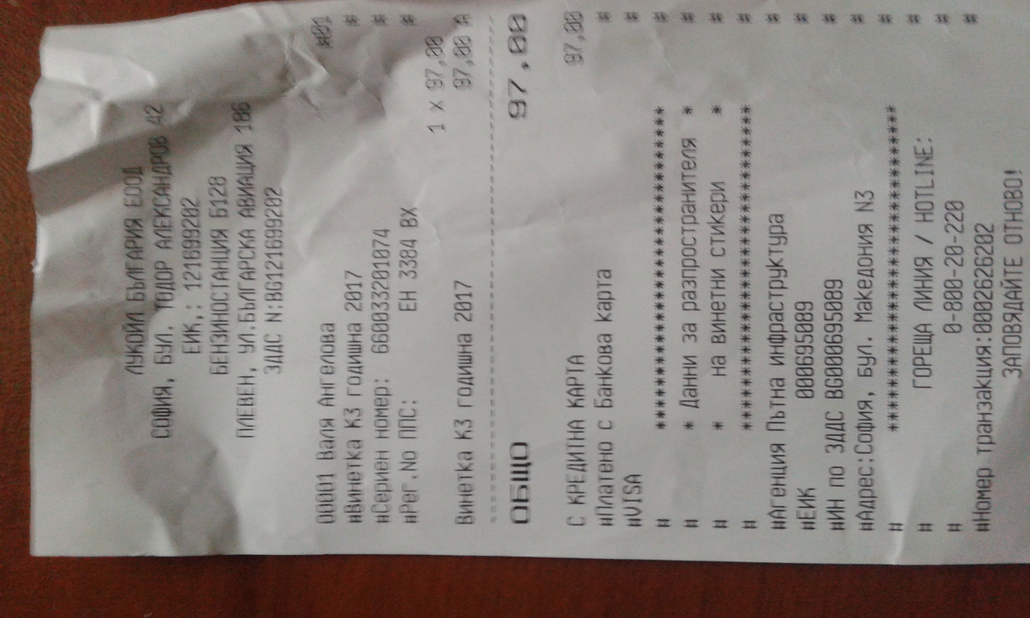 На 21.1 2017г.на тръгване за село спирам да заредя и купя винетка на Лукойл. Пращам жената да плати докато аз оправям мия стъклата,и тя се връща почти веднага.и казва че платила само горивото а за винетката искали рег. номер на колата.После носи фискалния бон и наистина го има номера на него.- Благовест