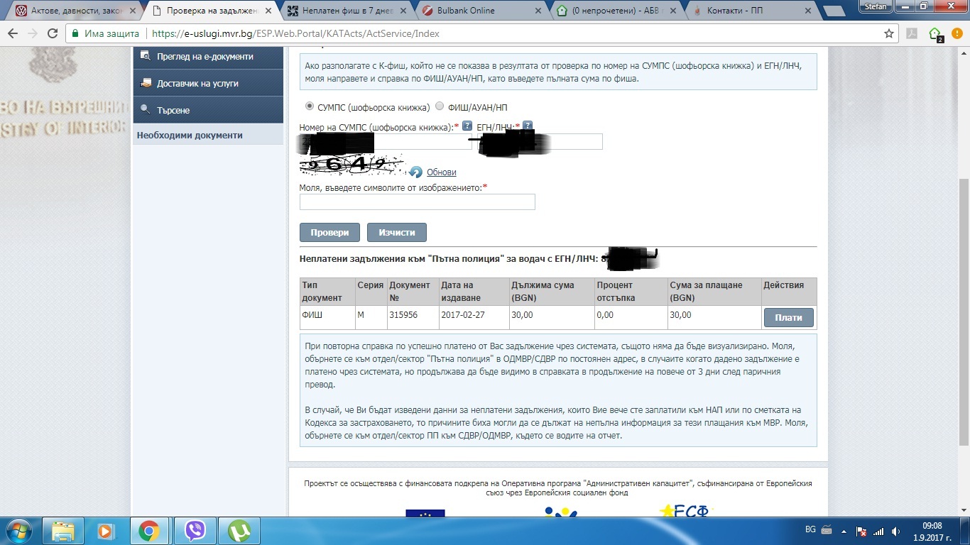 Най-накрая се наканиха да пуснат ел. проверка. Само дето ми вади един фиш отпреди година и половина, който платих навремето. Сега ще трябва да се разкарвам до КАТ да им доказвам. Добре че съм се приготвил с извлечение от банката с печат след като го платих през банкирането. Иначе повечето банки не могат да ти намерят плащането, ако не кажеш в кой месец е било. И те са много напред с "електронните" услуги.