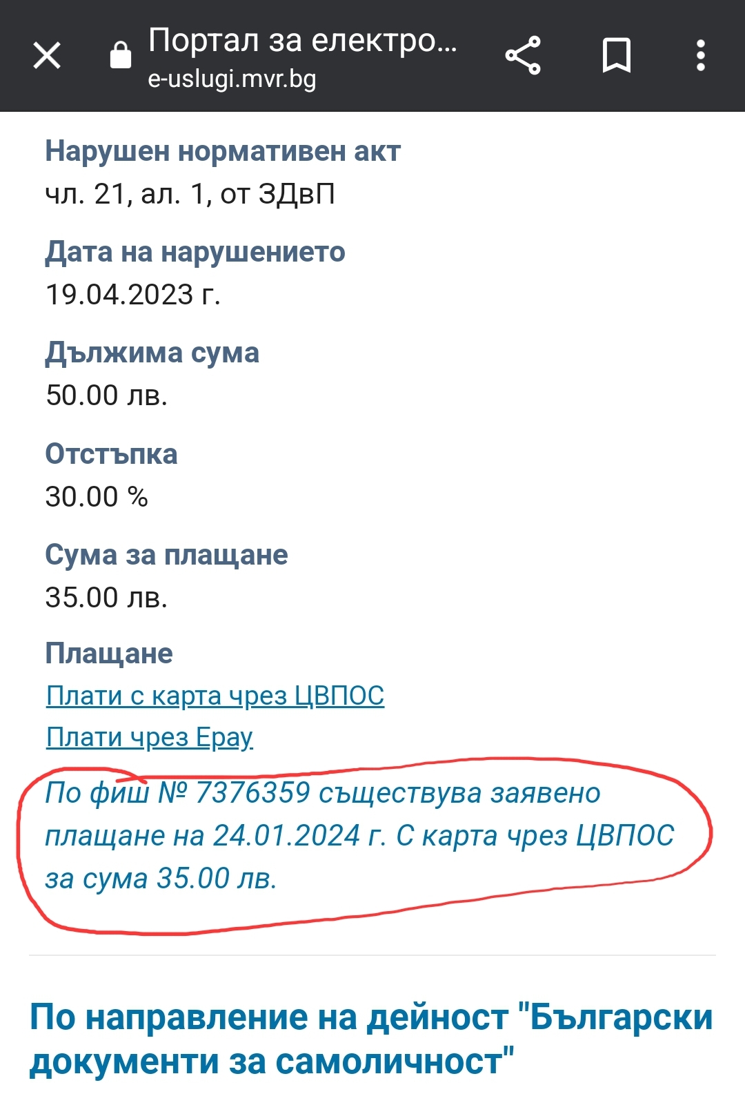 VWGT написа:Доколкото разбрах сега са добавили и справка за невръчени ел.фишове и възможност за плащането им. Аз май имам невръчени фишове. И точно заради това ми е чудно как ще платиш невръчен фиш (ако проверката не се счита за връчване).