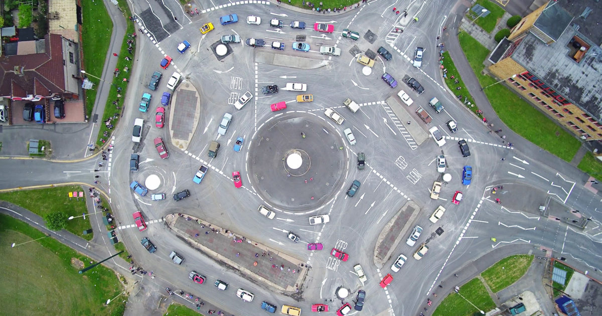 Ето и в северната ни съседка. Като нашите са. Абсурдно е кръгово да се регулира било то със знаци и още повече със светофар. В случая се вижда при неработеща светофарна у-ба кой е с предимство. Абсолютен шит е в груговото да си без предимство.