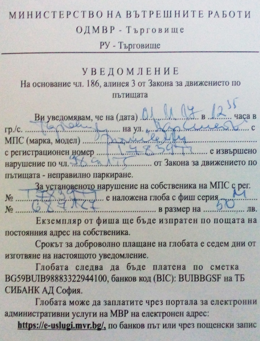 Фиш за неправилно паркиране от вчера... (настъпана 5см пешеходна пътека тип "квадратчета"..., просто нямаше никакво свободно парко място в района, обиколих квартала първо...).
