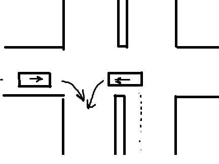 В един определен момент и двамата ще са на червения път и единия ще прави ляв завой , а другия десен. Ако не са по едно и също време на червения път то няма да има конфликт, просто завива този , който първи е започнал маневрата.