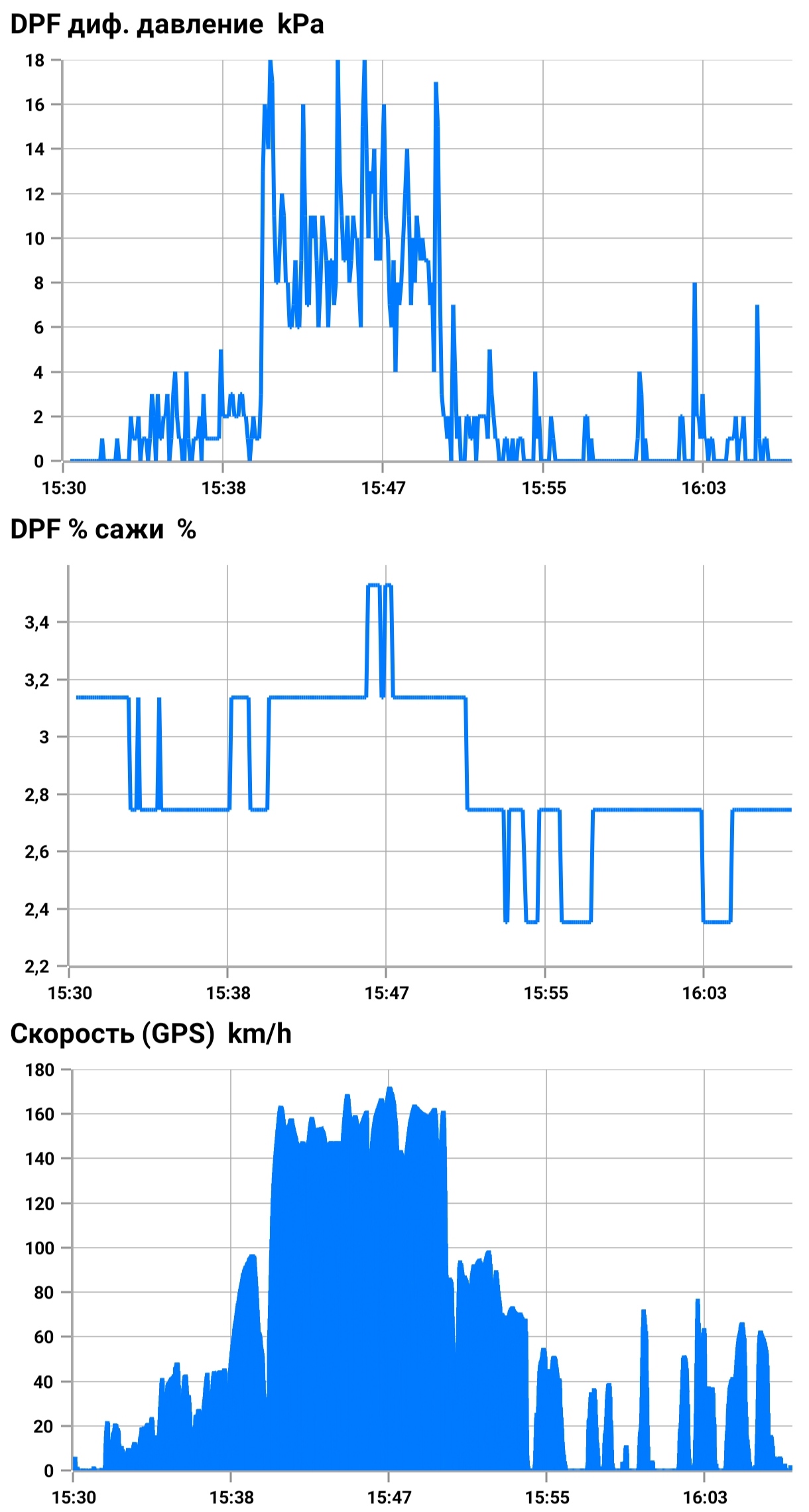 Колеги, два-три въпроса към знаещите. Днес покарах трийсетина километра, като бях закачил "Car Scanner" за да свали малко живи данни. Нормално ли е корекцията на дюзите да е толкова начупена линия, не трябва ли да е по-равномерна? Може ли от тези цифри да се съди дали всичко е наред с тях или има евентуален проблем? На другият скрийншот се вижда, че диференциалното налягане на DPF филтъра достига до 18kPa, това нормално ли е да е така, при положение, че не е кой знае колко пълен със сажди? Нарочно съм оставил и данните за скоростта, вижда се, че най-високото налягане е при най-високата скорост, т.е. при по-високи обороти.
