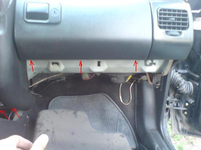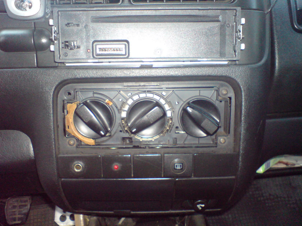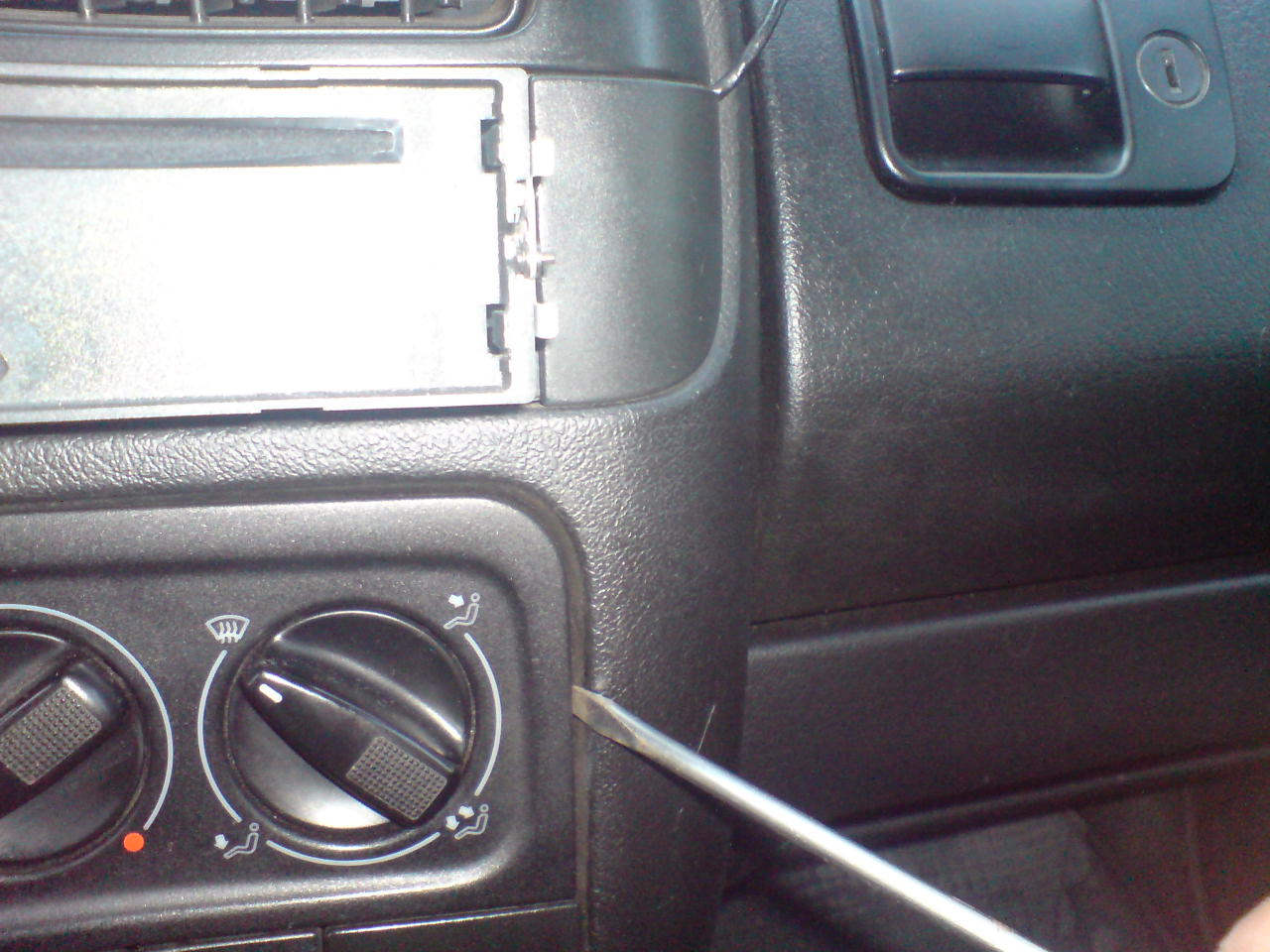 - Отвиваме 4-винта в краищата на конзолата с "врътките" и 2-та винта зад пепелника. и махаме рамката цалото панелче като откачаме буксите на подгева на задно стъкло, запалката, изводите за тест на CPU-то и всички други, които нашата кола има. (Немеца ги е направил различни по форма цвят и големина та неможе да се сгрешат при сглобяването)