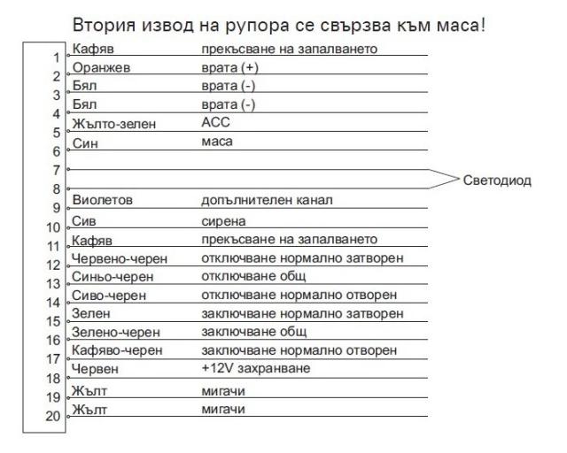Кабелите от вратата са три. Намиращ кой е общия и го свързваш с двата от алармата на които пише "общ" .Тези на които пише "нормално отворен" ги връзваш към тези които са за откл. и закл. Ако системата действа "наопаки" т.е. при отключване заключва , разменяш местата на последните два проводника.