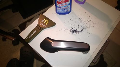 Първаначално изтърках една от страниците на задния пепелник директно с гъбата и останаха много белези. После търках другата кръгла страница с една монета и стана по-добре, но пак останаха белези. Всички това бе докато не се сетих за решението и търках с монета обгърната с мокри кърпички самия голям пепелник и стана перфектно :)