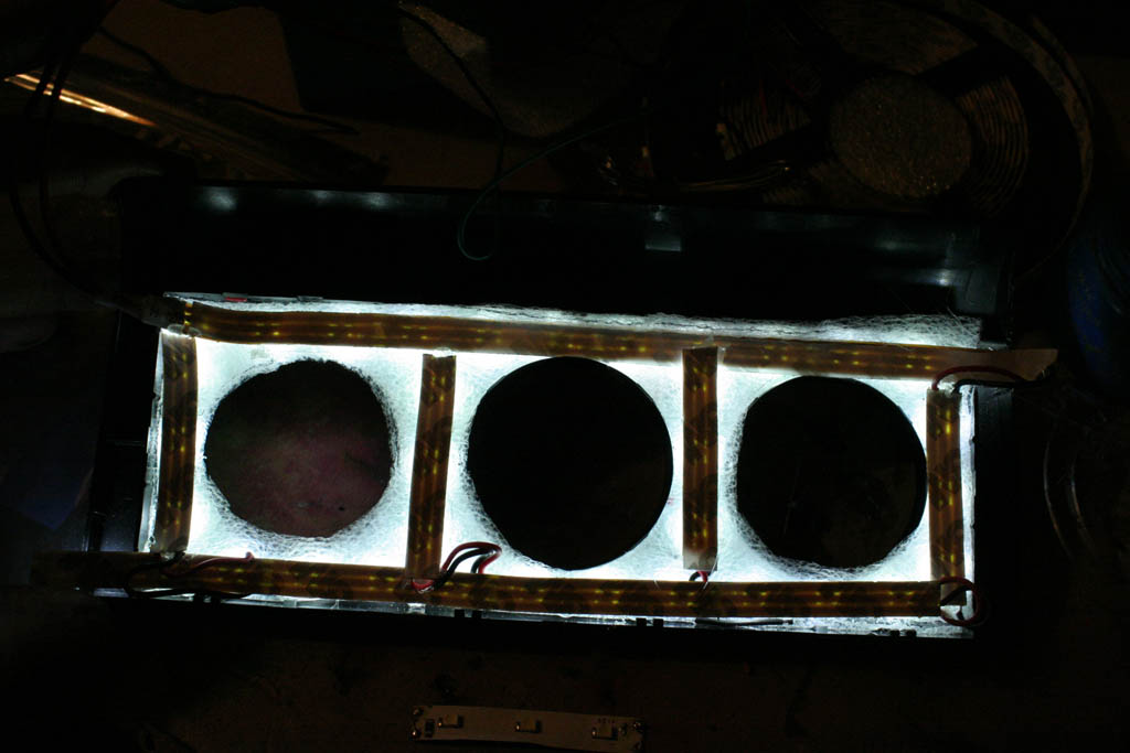 Фолиото е на два пласта за по-добро дифузиране на светлината. Върху него залепих с топъл силикон светодиодните ленти. Ето какво се получи: