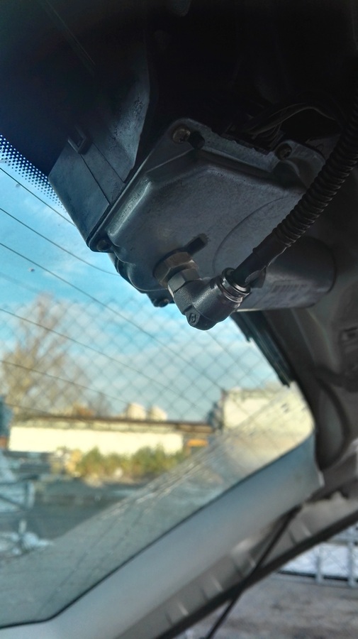 Разпробива се оста на чистачката с боргия 4мм. Оставят се около 1-2 см. от старата тръбичка (от към входа, не от към дюзата). Нанизвате там маркучето от системата. Важно е да режете системата само от едната страна. Т.е. използвате единия от оригиналните краища на системата (които завтршват с игли или нещо такова). Естествено, махате иглата, да остане само прозрачното маркуче. Това се прави, защото там маркучето е леко стеснено и там дюзата влиза перфектно.
