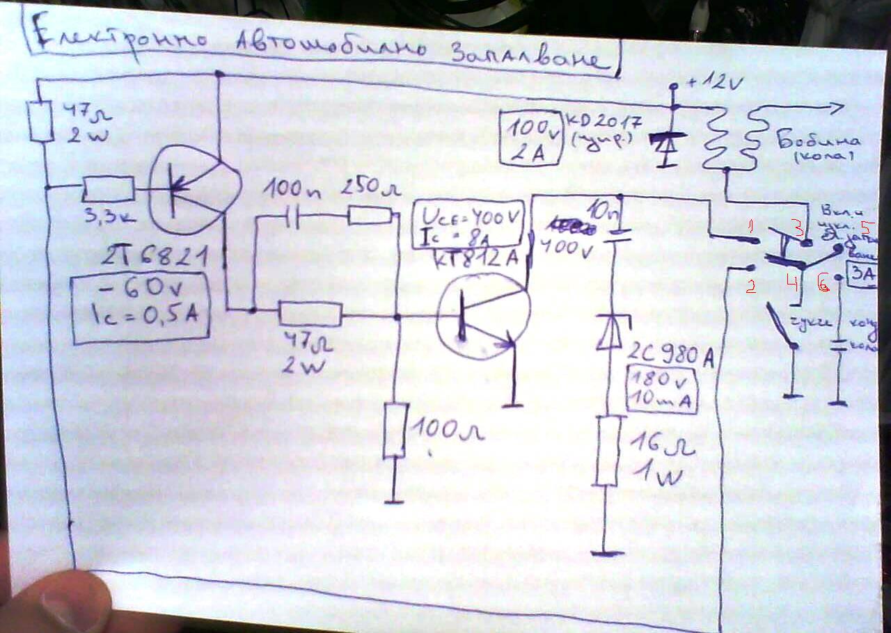 А сега още нещо интересно. С тази схема смаях хората от един сервиз по време на годишния преглед на старата ми кола. Тя беше една стара Шкода 105L, а бях и монтирал това електронно запалване. Извинете ме за почерка и лошата графика.