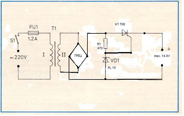 Схемата се състои от грец 1000V/50A - китайски (продава се в електронните магазини). "Автоматиката" е съставена от три елемента - чешки тиристор КТ 708, ценер PL 15 за 15 V опорно напрежение, и накрая резистор 470 ома/ 1 ват. Целият монтаж е обемен, като на тиристора е необходим радиатор (някаква ламарина). Заряда изключва при достигане на 14,4 V. Използвам кутията и трансформатора на 30 годишно пернишко зарядно "Кракра" - добре познато на старите автомобилисти (стария селенов грец съм заменил с по-горе посочения). Предполагам, че изработката няма да е проблем на по-вечето колеги.