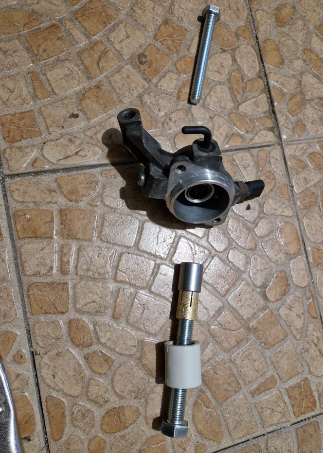 По-безопасния начин според мен е вместо да тупам отгоре с чука да бях нанизал парчето тръба в големия болт преди да го завия в анкера. Тръбата да служи за опора като ляга плътно на равнината на избирача, а в нея да влиза стария лагер при изваждането му. След като разтворя анкера и навия отгоре малкия болт, да ги сложа легнали срещу двете челюсти на менгемето, като с челюстите се хване малкия болт от едната челюст и парчето тръба от другата челюст срещуположно и с навиване на менгемето малкия болт да избута лагера през отвора на PPR муфата. Не стигнах до този начин защото лесно се предаде с чука. Набиването на новия лагер стана чрез натискане с менгемето и подложка от широка шайба за да подведе лагера в правилен ъгъл.