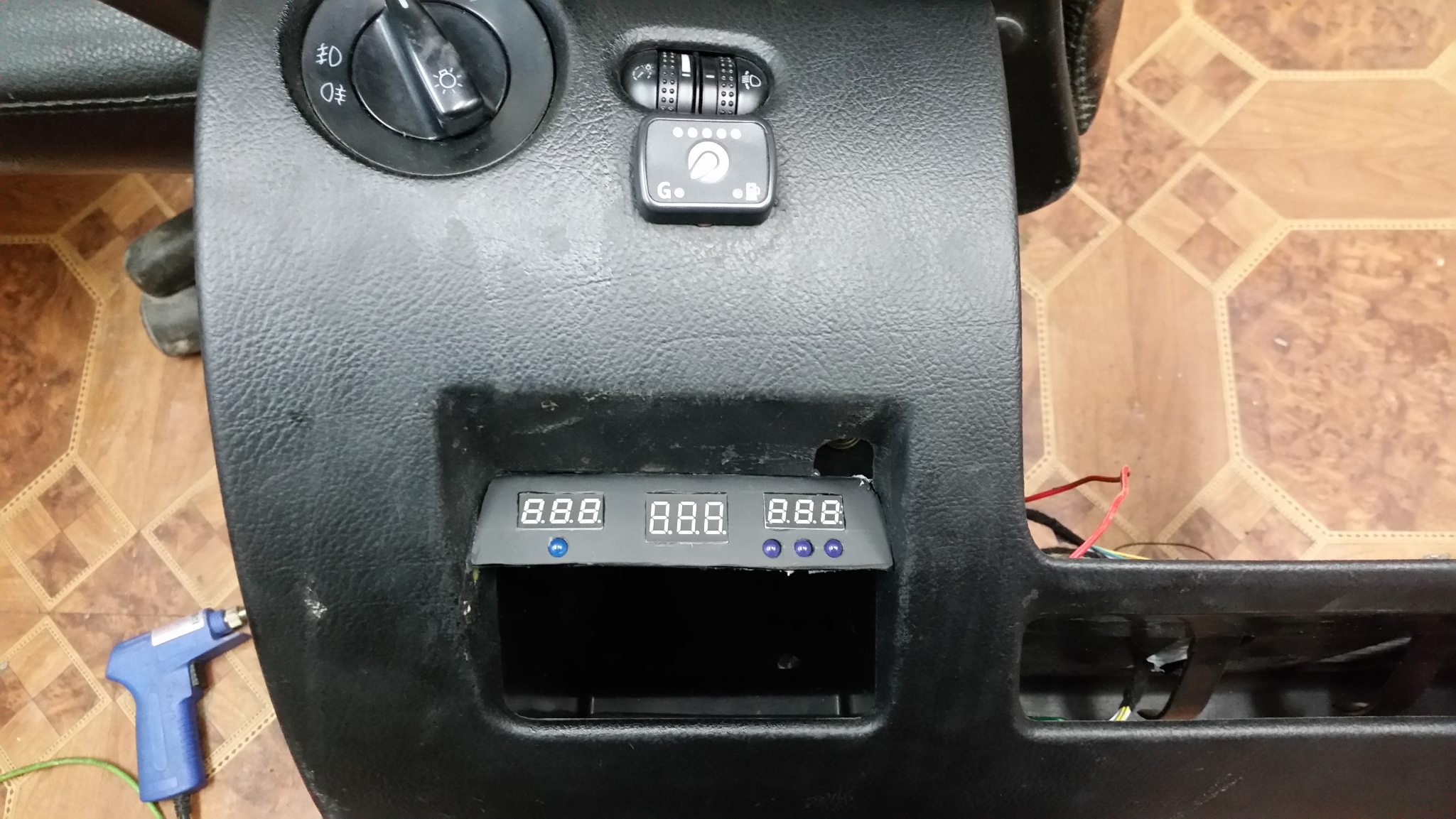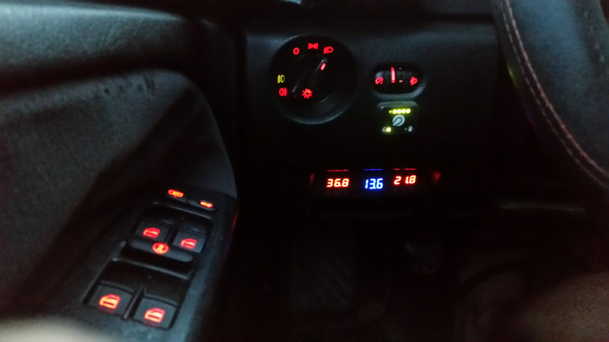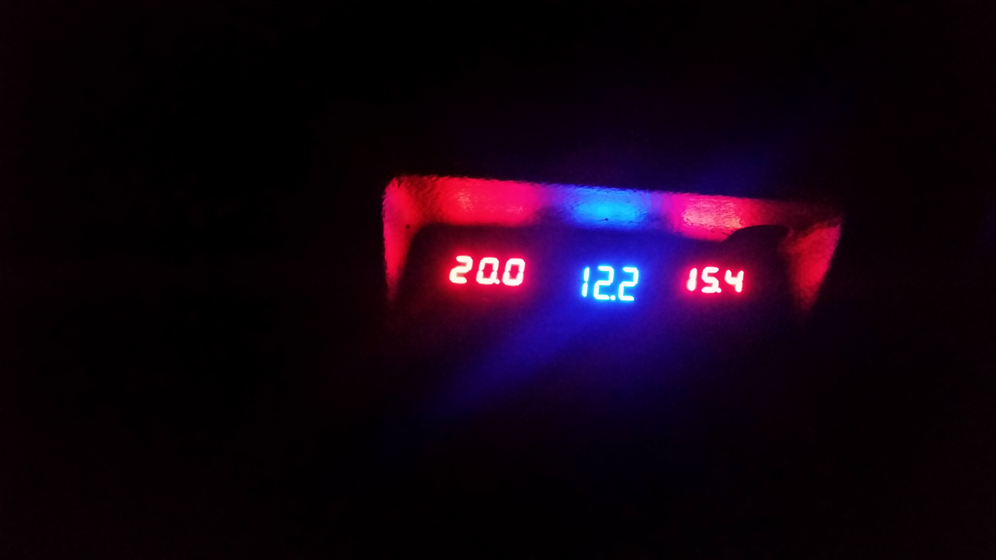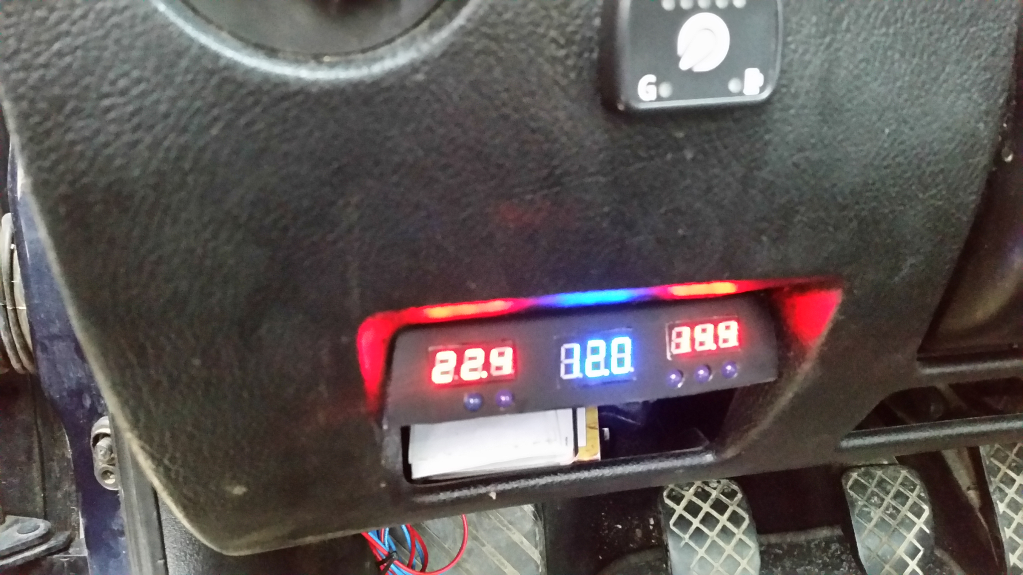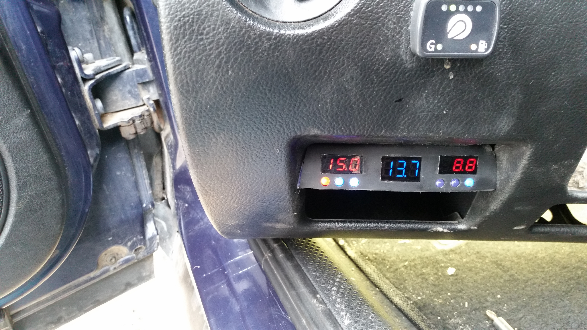 В ляво е дисплейчето за течността на чистачките, в средата е волтметъра, в дясно е външната температура.