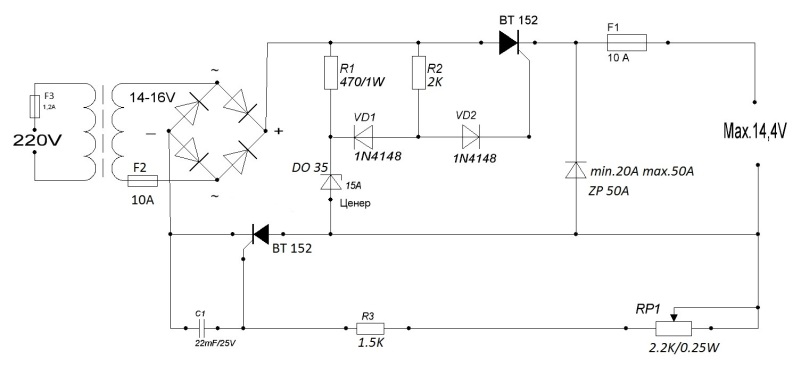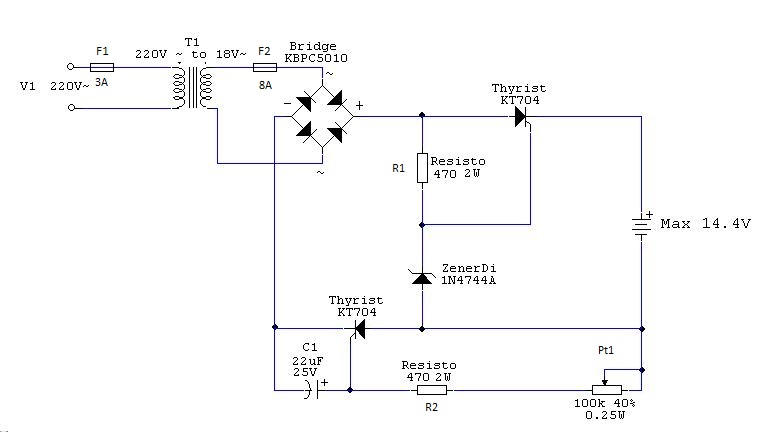 minko1950 17V след трафа е ниско напрежение. Понеже имаш пад на напрежение в греца ( 2x1,2V )и тиристора ( 1,4V ), общо: 3,8V! Тогава ще имаш максимално зарядно напрежение върху акумулатора: 17-3,8= 13,2V и няма да можеш да направиш пълен заряд на акумулатора!