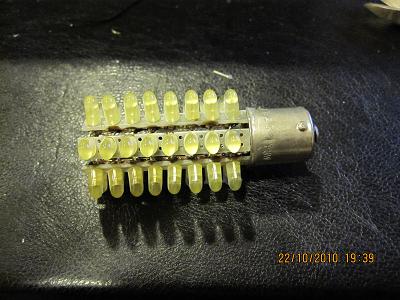 значи диодите които съм използвал са 120градуса ,около 1000mcd. /3,1 лумена/ жълти ,цената им в комет е около 20ст.Диодите съм ги свързвал по 8 в паралел /ивичка/ ,а ивичките последователно,които са 6 на брой,резистори в този случай не се наложи да ползвам.Цокъла е от стара крушка.