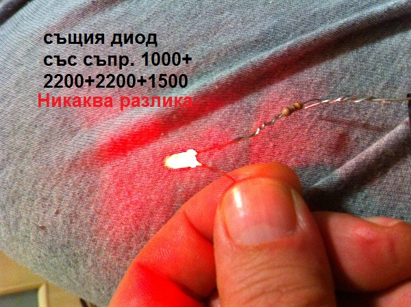 Не знам как си го свързвал този резистор, но съм абсолютно сигурен, че ако свържеш два резистора по 2200 ома последователно, както твърдиш диодите почти ще угаснат. Нещо бъркаш при свързването, няма как да продължават да светят силно.