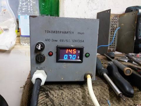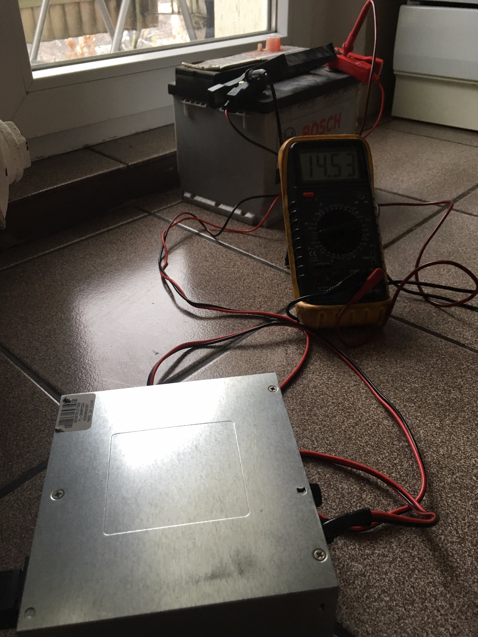 На празен ход напрежението е от 12.8 до 13.1 V, при свързване на акумулатора се покачва (зависи колко е изтощен). При мен като закачих стана 13.8/4.5 А, но сравнително бързо се вдигна на 14 и тока спадна. На последната снимка се вижда след около 5 часа заряд и пауза, тока е 1.9 А (или поне толкова ми показва мултицета). Максималното напрежение е около 14.6 и ще го оставя така