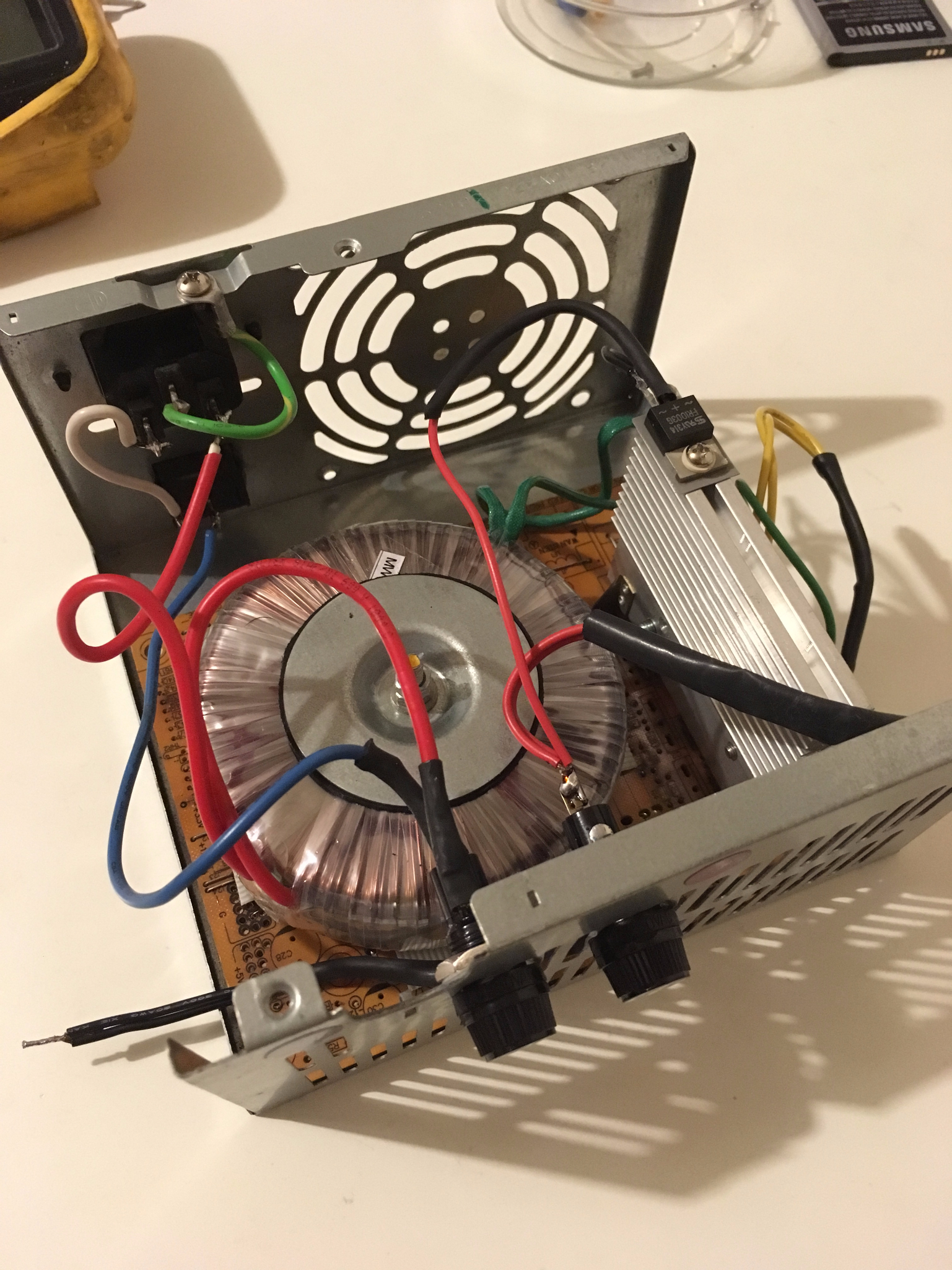 Използвах кутия от АТХ (класика), даже ползвах платката му като основа, след като махнах всички елементи. На снимките се вижда междинен етап, забравих да снимам точно преди да го затворя след корекциите. Е, изпуках един бт152, ама така е който го мързи да чете, после се сетих да отворя дейташиийта и да видя, че тока на гейта е 10 пъти по-нисък от на кт708