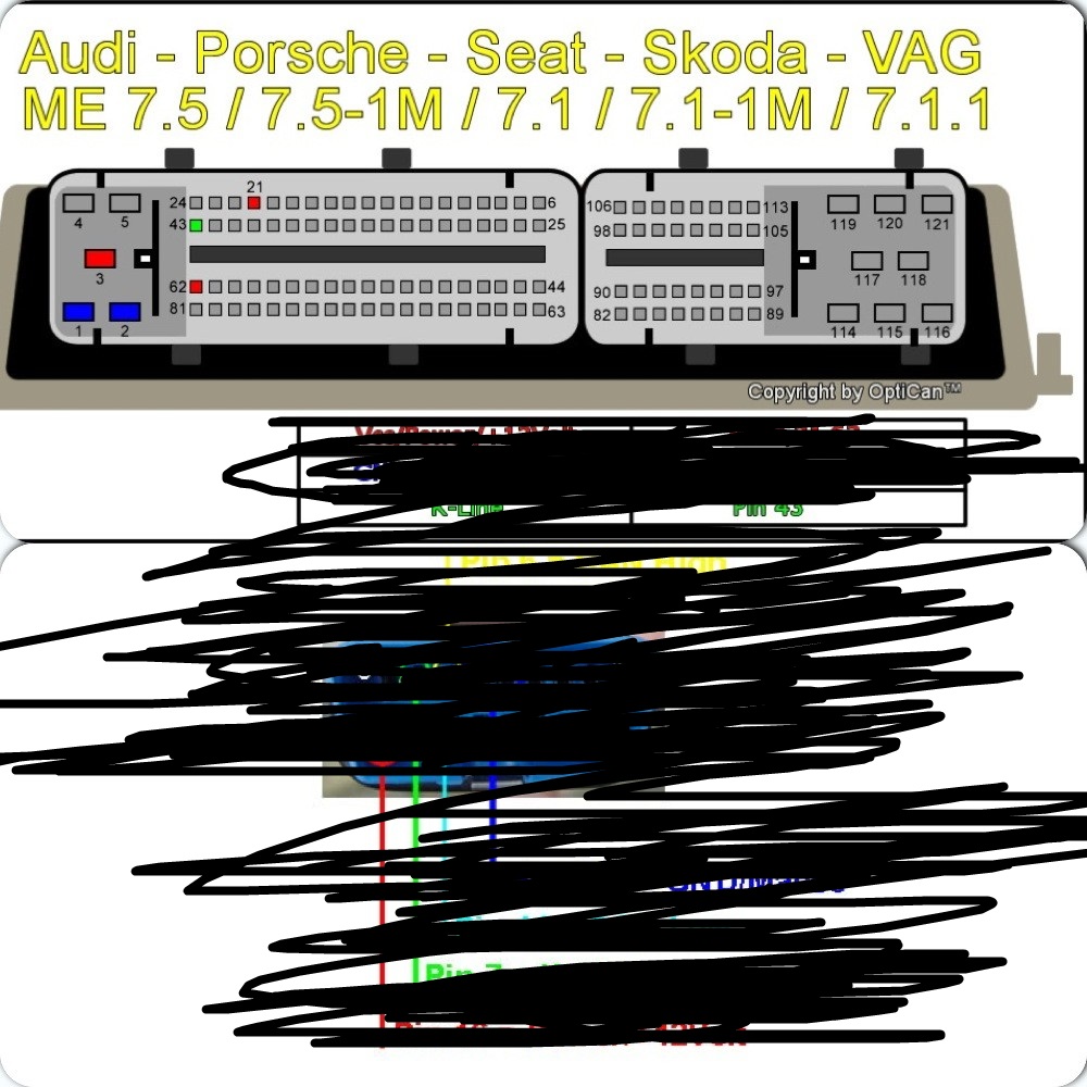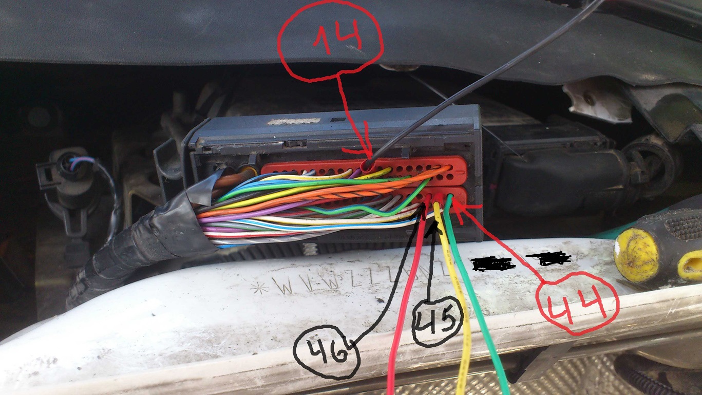 И аз се реших да пробвам,за сега само свързах кабелите към ECU.Свързах кабелчета към пинове 14,44,45,46 използвах схемата на снимката по-долу,малко се бях заблудил дали е клемата на ECU или на буксата но,предположи че е компа.По-компетентните да кажат дали съм на прав път-автомобила е Polo 6N2 2001г. двигател AMF.Втората снимка е това което съм направил