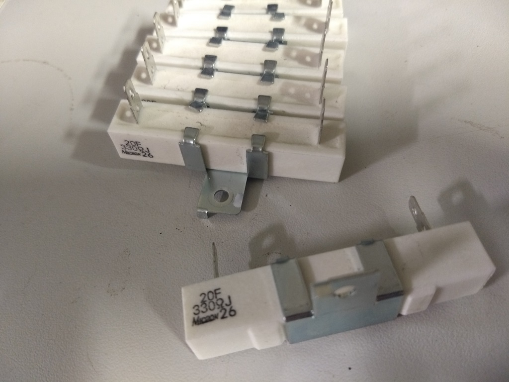 Тези не стават, с много голяма стойност са, ако са еднакви де. 330 Ohm ... ще ти трябват 100 броя свързани паралелно (успоредно). Ако намериш 10-на подобни, но 3.3 или 4.7 Ohm ще стане добре. Аз ги смятам, че са 20W, това 20F вероятно това значи. Каква е дължината им?