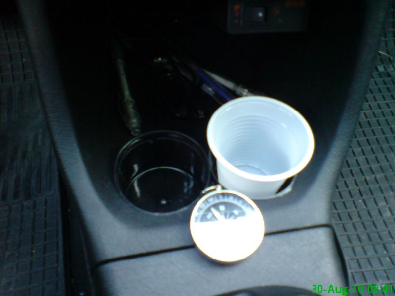 аз също се запалих като четох темата и си направих cupholder по хамерикански.... за целта пробих два леко елипсовидни отвора и натиках капачки от спрейове.... седи си недодялано но пък върши работа като за без пари... издържа тест от почти месец...