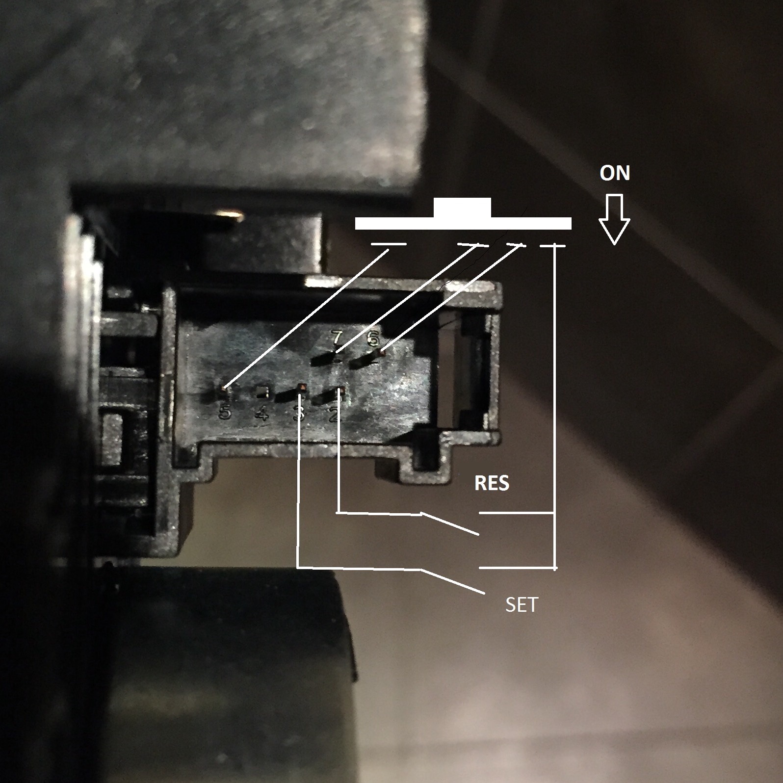 При мен това е схемата погледната и измерена на самата букса на лостчето за темпомата.