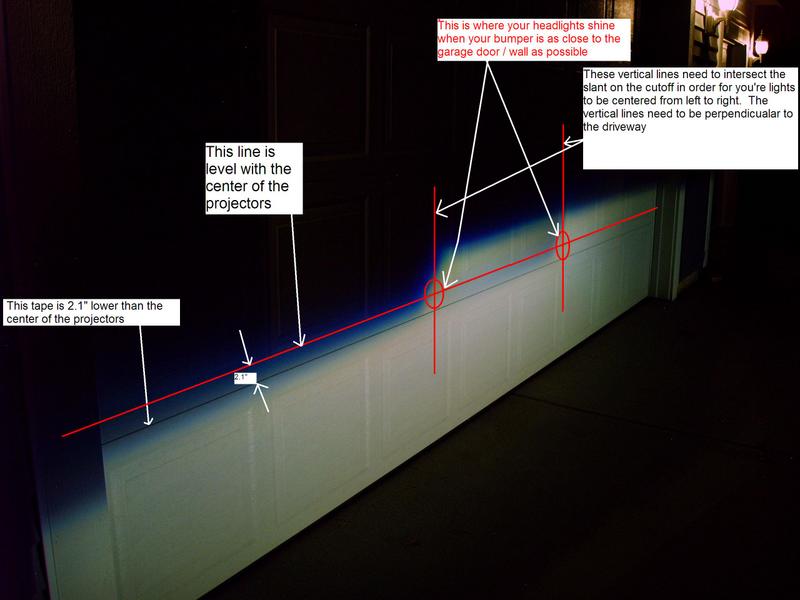 10. Drivers Side UP/Down: Bring the lower step of the cutoff to or below the tape line that is 2.1" lower than your headlights...Dot Spec is 2.1" to 2.5" drop over 25'