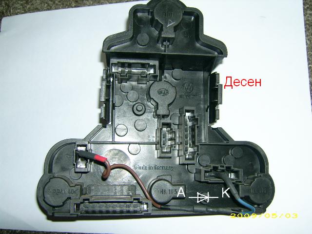 Това се преодолява със свързването на още един диод на захранващия кабел за светлината за мъгла с катода към крушката някъде преди буксата влизаша в левия стоп.