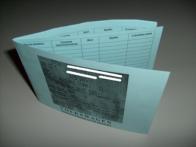 Ето какво се занимавам последните 15 мин. винаги си водя история какво сменям по автомобилите в разни тефтерчета , файлчета, листчета, реших да си отпечатам мини сервизна книжка с размери А4/4, която да се търкаля в колата и да я попълвам когато има нужда, на предната корица е VIN стикера снимах лепенката в багажника ... и те така.