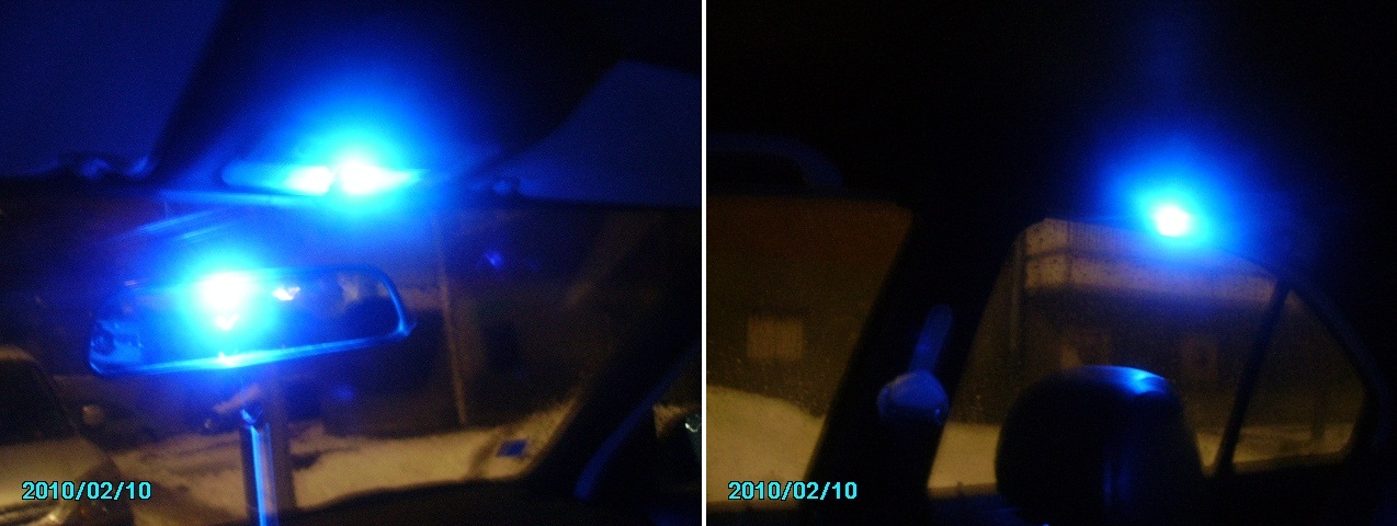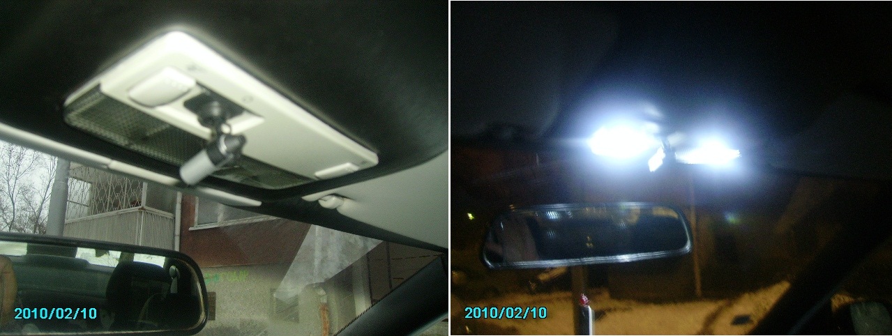 2. Прекъснах връзката на тези крачета, за да не светят при отваряне на вратата крайните крушки, които са с ярки бели диоди, а само в средата, където сложих две паралелно вързани диодни крушки с по два сини диода(общо четири) в корпус на сулфидна крушка. Направи ми впечатление, че сините крушки както на предния, така и на задните плафони след изгасяне продължават едва доловимо да мъждукат, но толкова слабо, че се забелязва само през нощта. Реших, че се дължи на някой кондензатор по веригата, но когато вързах и гореспоменатото мини прожекторче, то след изгасяне не просто мъждукаше,а направо продължаваше да си свети, но по-слабо.