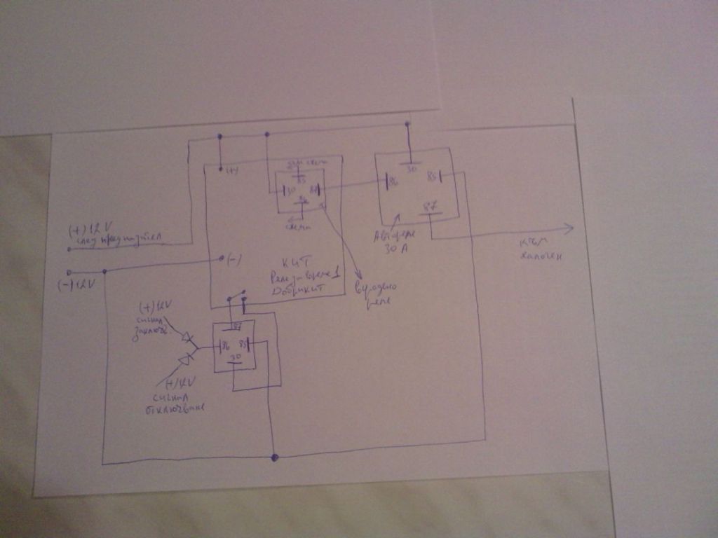 Китчето Реле за ........ се захранва/входа/ с постоянен/+/ и /-/.Изхода се свързва с клема 85 на релето 30 А