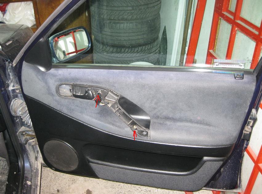 На тази снимка съм показал с червените стрелки къде се намират 2-те винтчета които също държат кората на вратата. След като се развият и те, издръпваме кората към нас и след това я повдигаме леко отдолу да се откачи от щипките.