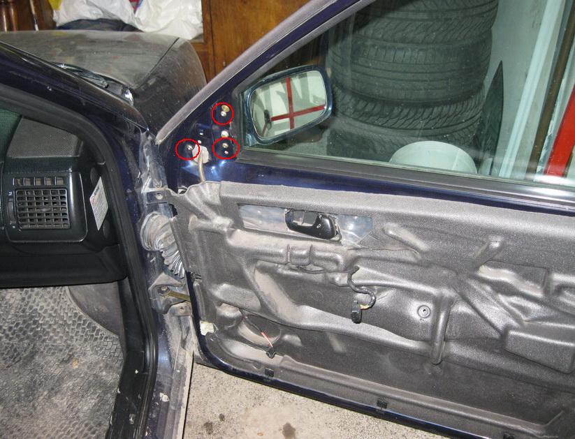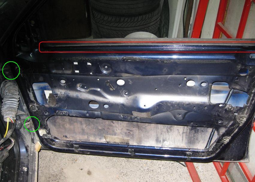 Вече сме савлили всичко от вратата. Прозореца се сваля като е откачен от омеханизма посредством двата болта и лайстана коятго се намира в ограденот ос черевно място се махне и прозореца се издръпва нагоре и излиза от вратата. Кабелите от снопа който влиза във вратат се махат внимателно през отвора. Няма проблем всички букси излизат без проблем от там, но по внимателно за да не перкъснеме вакумното маркуче или някой кабел. Във делено съм отбелязал къде се намират двата винта, които дръжат вратата. Винтовете са торкс Т45. Като се развият и врата остава в ръцете ви