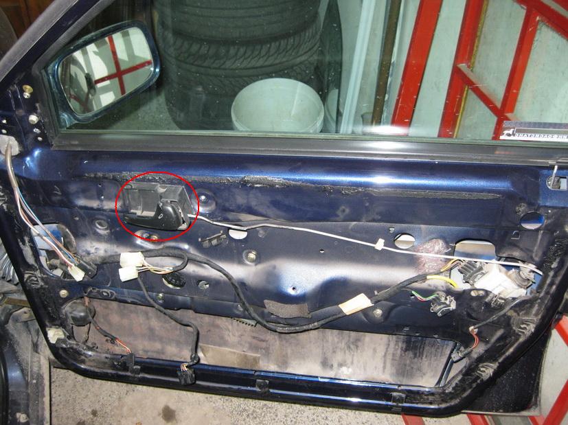 След като внимателно сме свалили стиропорената подложка под кората започваме да разкачаме буксите. С червено кръгче съм оградил буксите за ел.огледалото, с жълто кръгче е буксата на колоната, с лилаво кръгче е буксата на копчето за ел.прозореца, със зелено кръгче е буксата на дръжката на вратата и със синьо съм отбелязал букстата която е за машинката за централното заключване. Зад ламаринката отдолу на машинката е свръзано и вакумното маркуче коте осе вади внимателно със издърпване, когато сме освободили машинката за центаралното от двете винтчета на които се държи