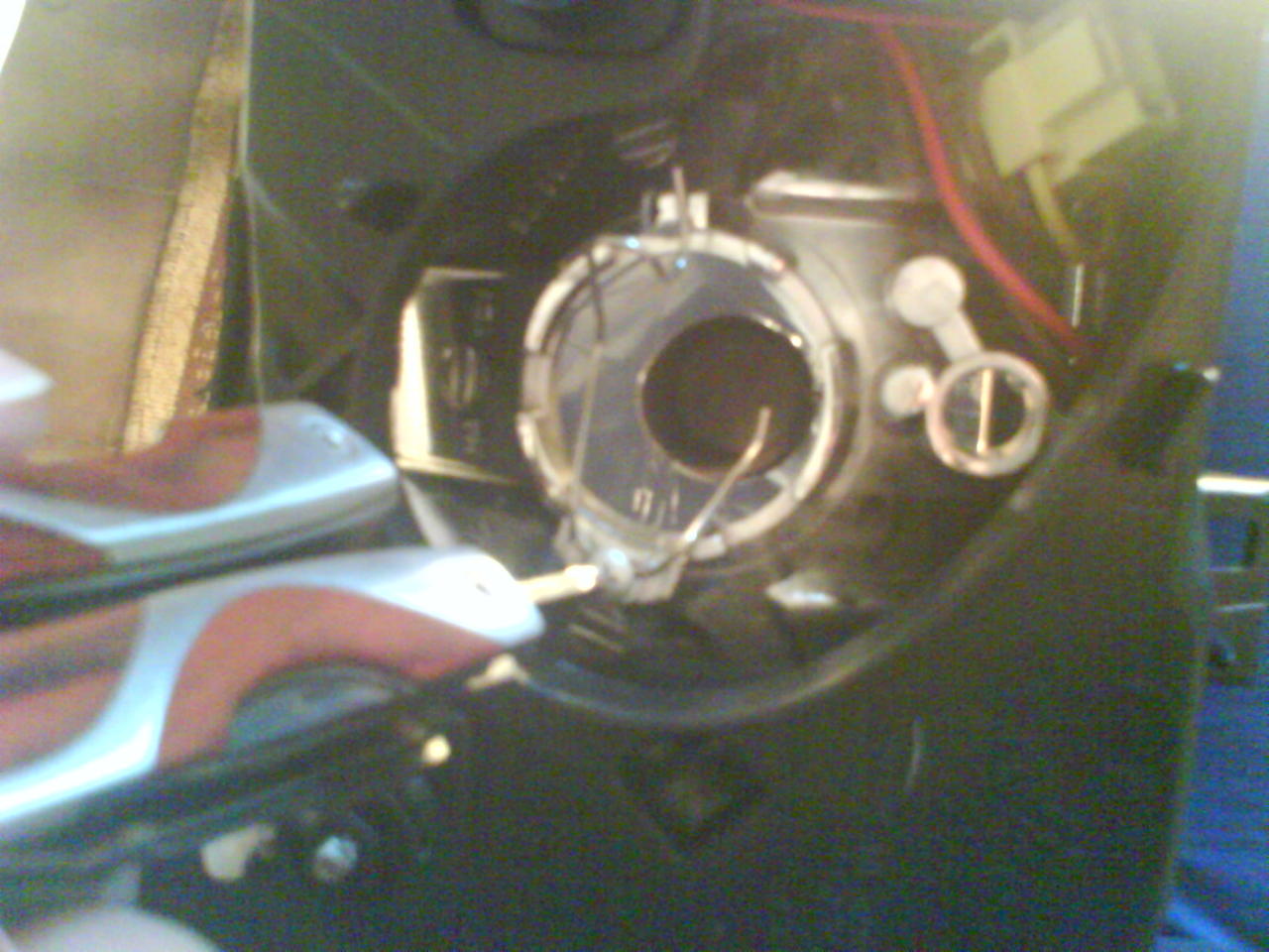 1. Кабелите от самата крушка до баласта си имат кръгла гумичка, за която се пробива подходяща дупка под и малко вдясно от голямата буква L горе (на същото място под R за другия фар).
