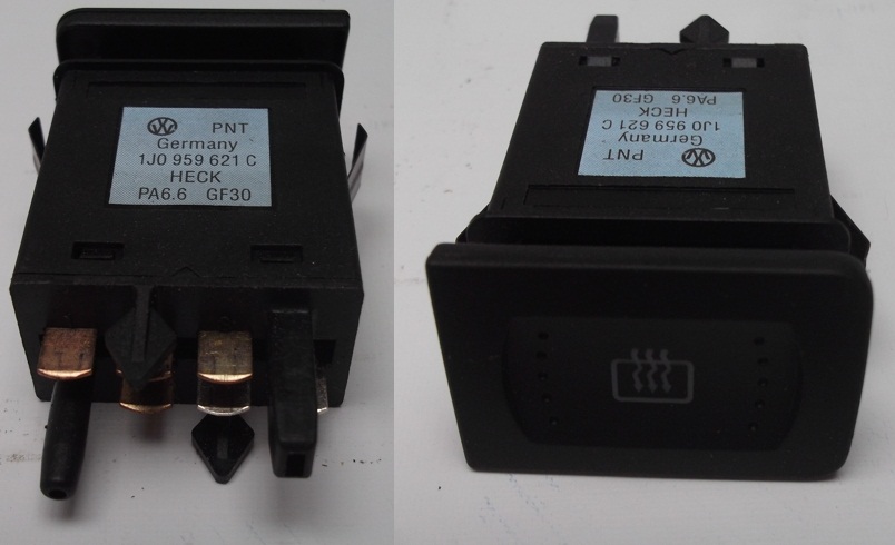 Малко разяснение кое как съм навързал. Плюса, който на схемата е взех от акумулатора аз съм го свързал към последния пин(кабел) на буксата за фаровете. Замерих и видях, че так се подават 12В при контакт. Това го направих с цел, халогените в бронята да се включват само при контакт. После имам свързан бушон 20А и от там към пин 30 от релето. От 87-ми пин на релето съм пуснал един кабел, който стига първо до едната крушка и после до другата. Масите на двете крушки ги вързах на един болт в двигателния кош. Пин 86 го вързах на едно болт на кормилната рейка. Дилемата ми е с 85-ти пин. За ключ използвам бутон за подгряване на задния прозорец (втори такъв бутон в колата). От този вид: