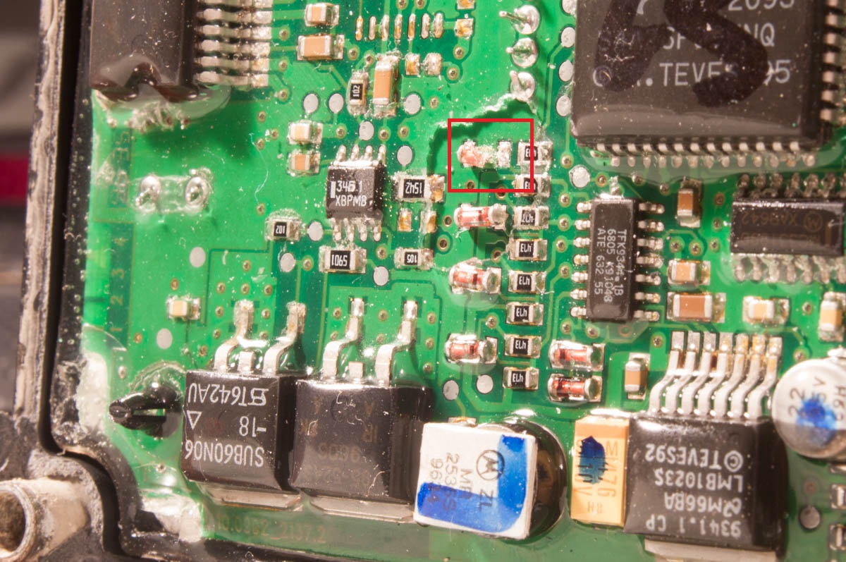Капакът е залепен и отварянето е доста трудно. трябва да се внимава, тъй като под него е платката и тя нетрябва да се наранява. След като го отворих забелязах че двете спойки на куплунга на помпата на ABS-a са напукани. Вижда се на снимка 2 и на снимка 3 долу вдясно оградено с червено.