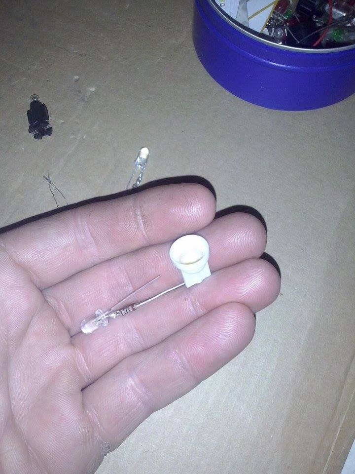 .А именно трябва само 2бр. диоди,2бр. съпротивления и 2бр. фасунки от стари диодни крушки.Запояваме и монтаж.- D'oh
