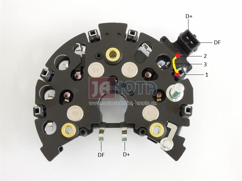 1 е връзка от статора към диодния блок, там запояваме едния край на кабелчето