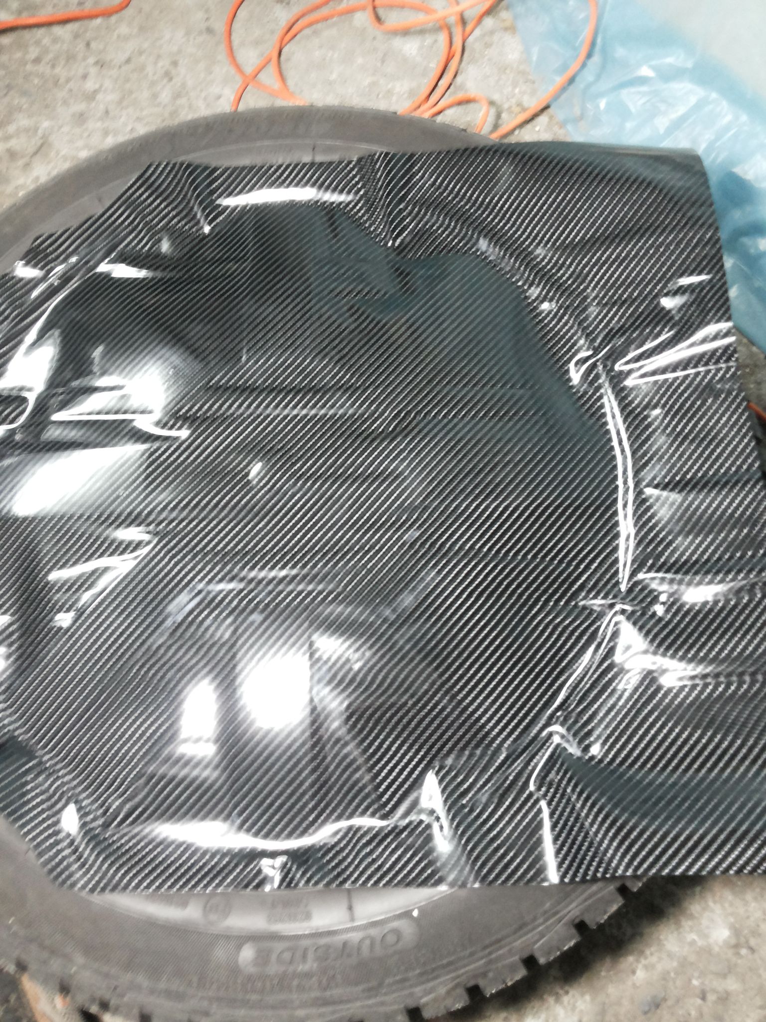 5-Идва трудната част (поне за мен първата джанта я правих 1час) измерих предварително след налагане върху джантата фолио колкото ми трябва (при мен понеже е 15"ка фолиото като размер бе някъде около 50-50см диаметър) отлепих долния слой и самото фолио от долу бе като кожа...залепих го равномерно върху джантата и с пистолет за горещ въздух започнах да нагрявам...на разстояние от около 40 до 60см в зависимост колко е силен пистолета.При нагряването фолиото почна да става разтегателно и доста еластично и докато ставаше така със парцал или ръкавица по дебела и гумена шпатула пак става започнах да натискам леко и да прилепям фолиото към краищата.