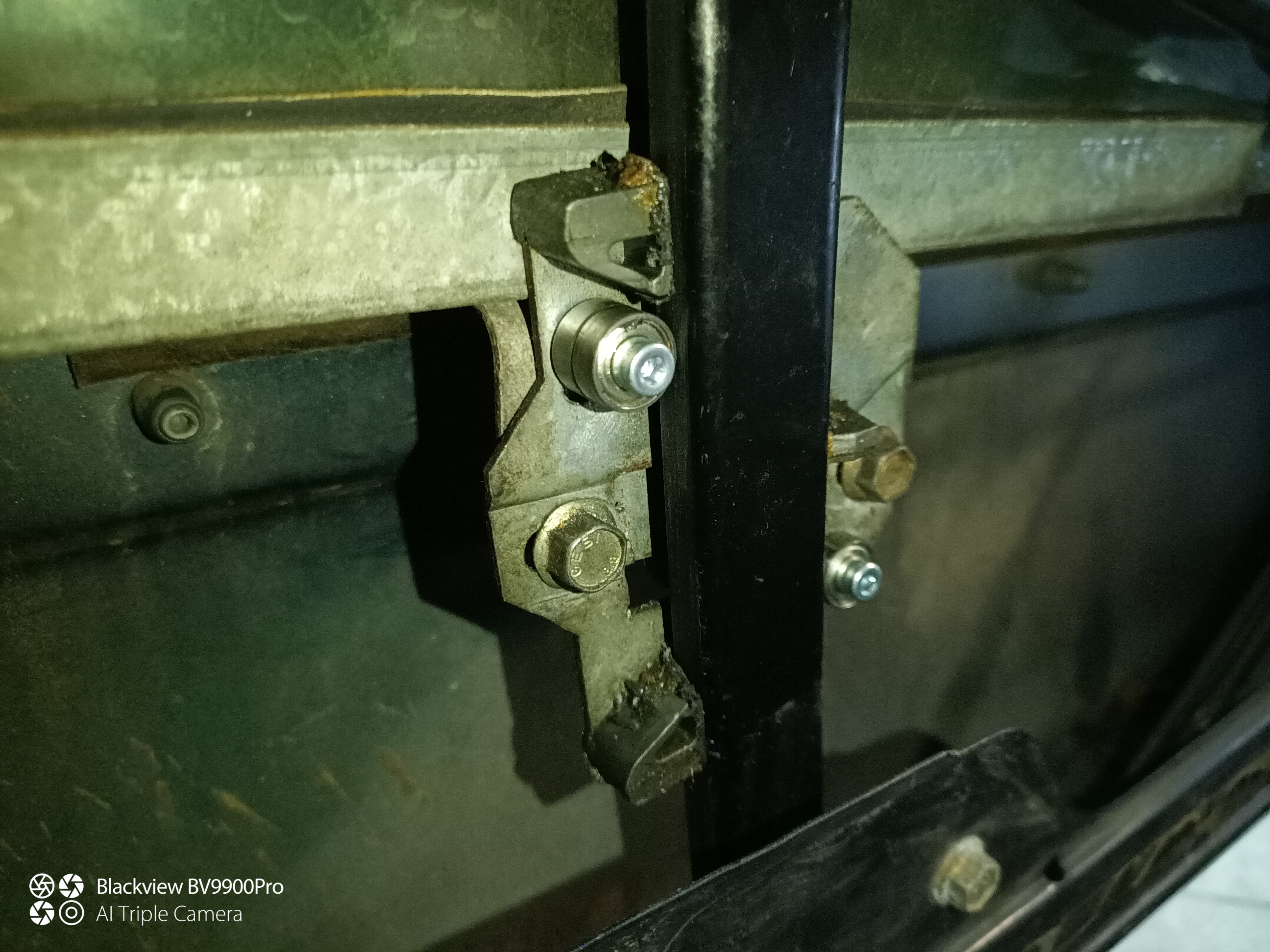 Без да свалям стъклото за половин час сътворих това и резултатът е доста задоволителен. С два лагера (един върху друг) отзад и един отпред. Използвал съм 4мм на 20мм болчета със стопорни гайки и малко подсигурител, за всеки случай. Като под лагерите съм подложил и по една шайба, за да може да се въртят.