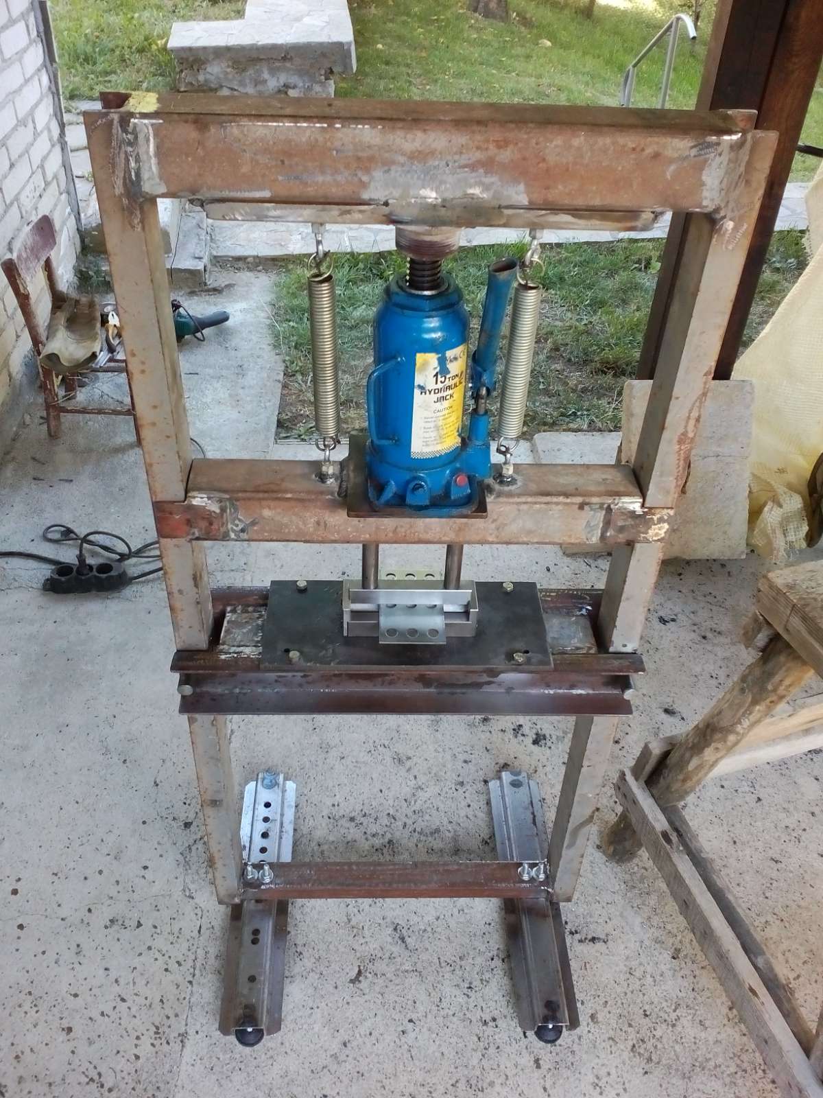 За да работи наобратно трябва да го разглобиш и да удължиш с тръбичка , мястото от където постъпва маслото при помпене. има клипове в нета-руските са най подробни. За пресата няма нужда от толкова заигравки, според мен. Пускам ти снимки на моята от обикновен бутилков крик. Тук е с приспособлението за огъване на ламарина, иначе е само със стержен за избиване. Ако намеря друга по нова снимка ще ти я кача.